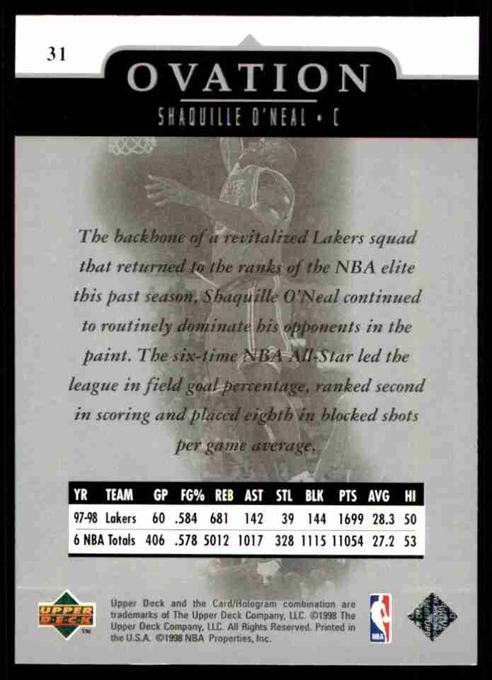 Shaquille O'Neal 1998-99 Upper Deck Ovation #31 Lakers