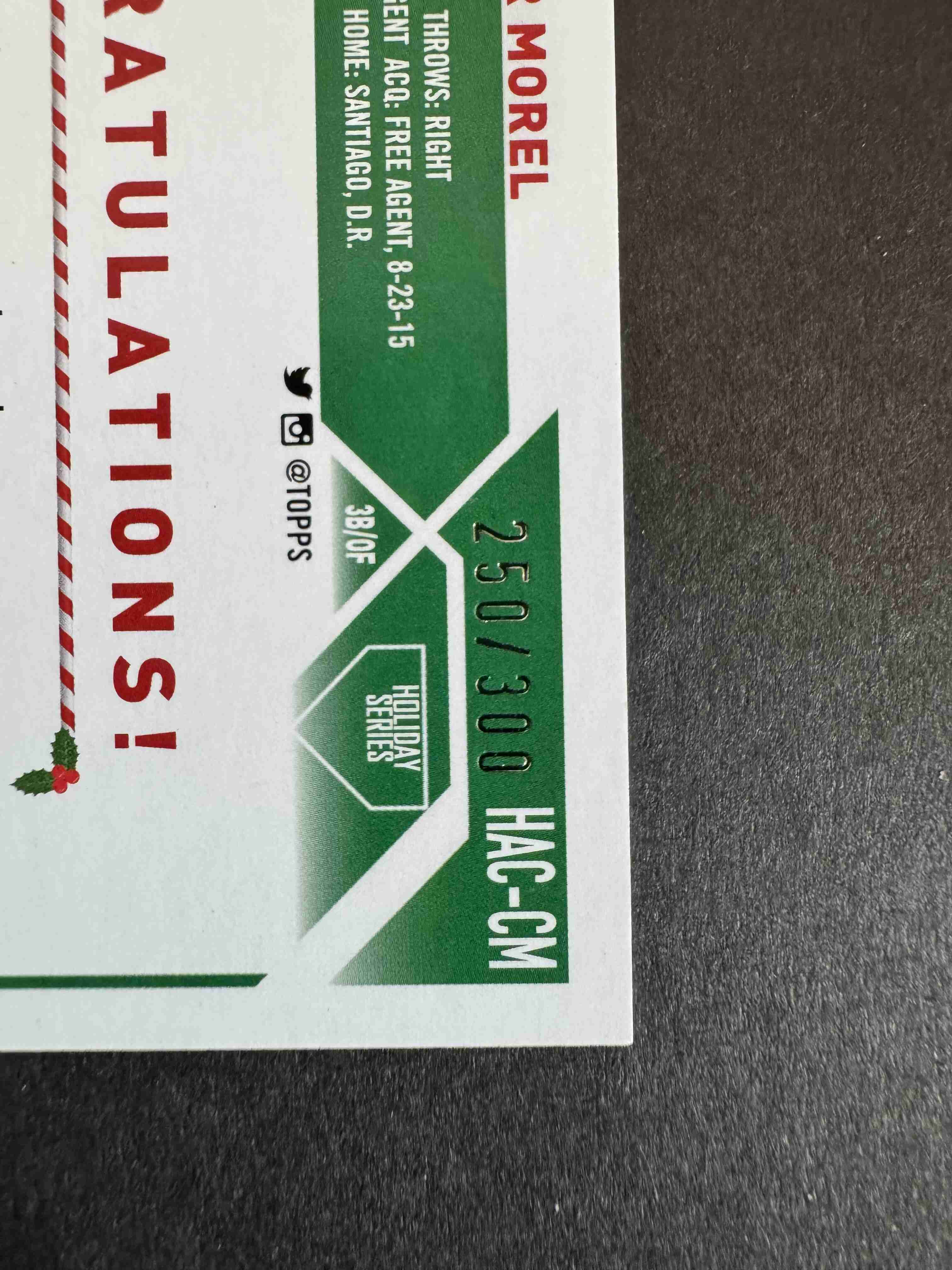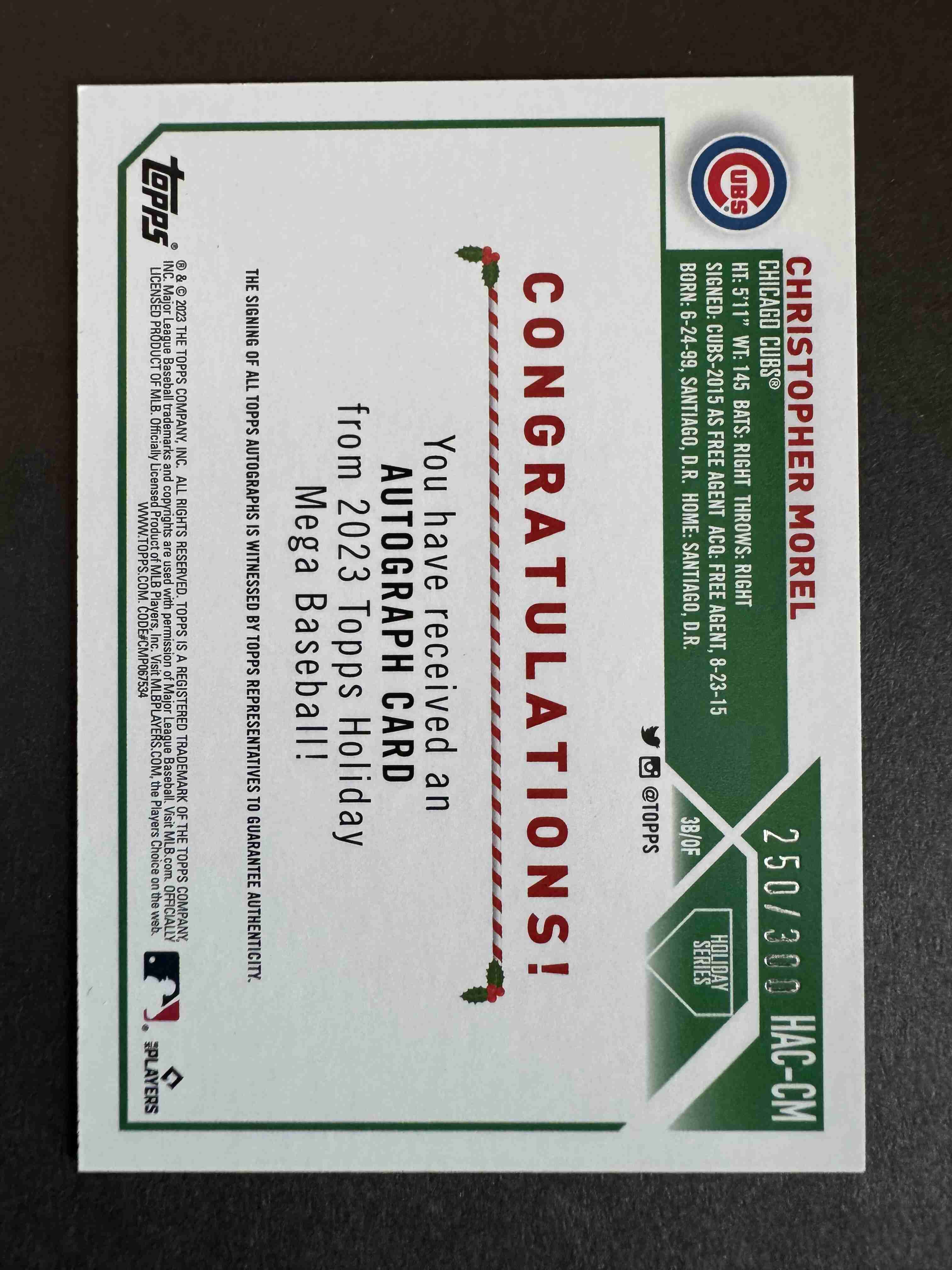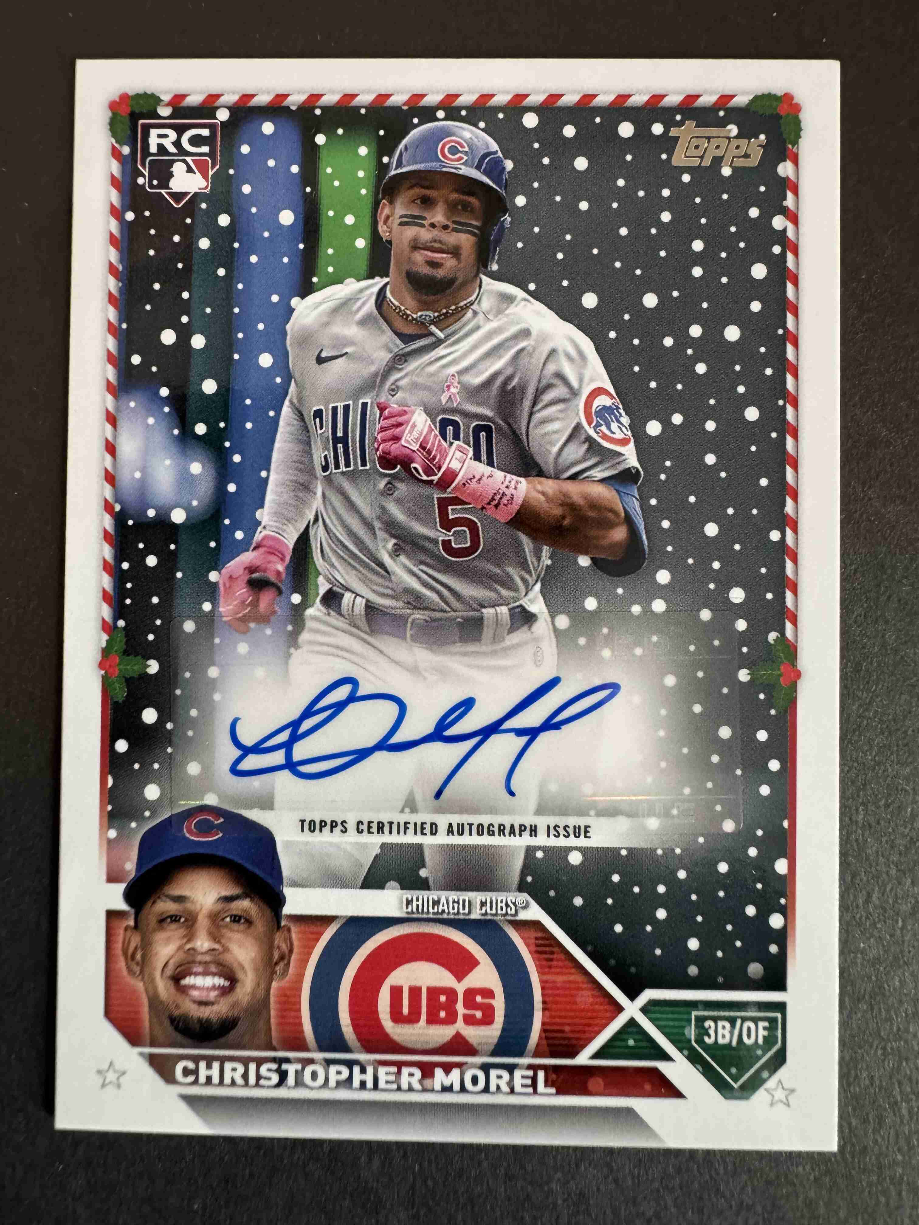 This auction is for a 2023 Topps Holiday Christopher Morel Autographed Rookie Card /300. The card ships in a Card Saver 1 and PWE.