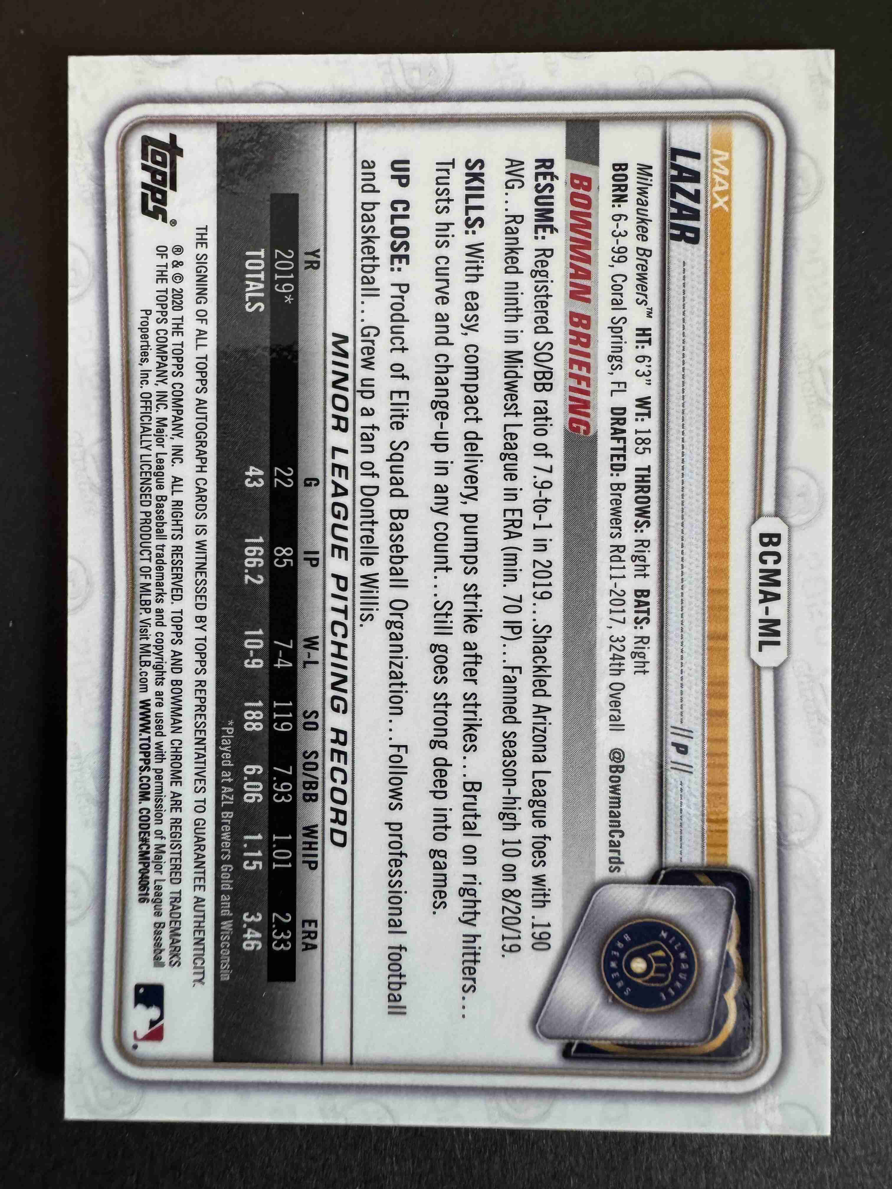 This auction is for a Max Lazar, 2020 Bowman Chrome Autographed card. Card ships in a Card Saver 1 and PWE.