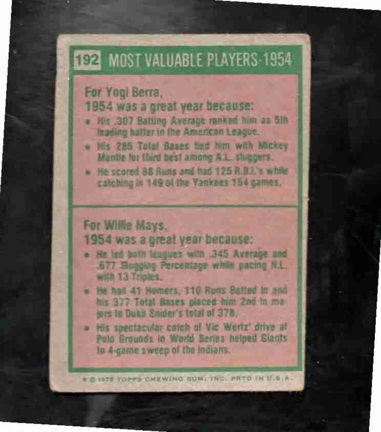 1975 Topps #192 1954 MVPs Yogi Berra & Willie Mays
