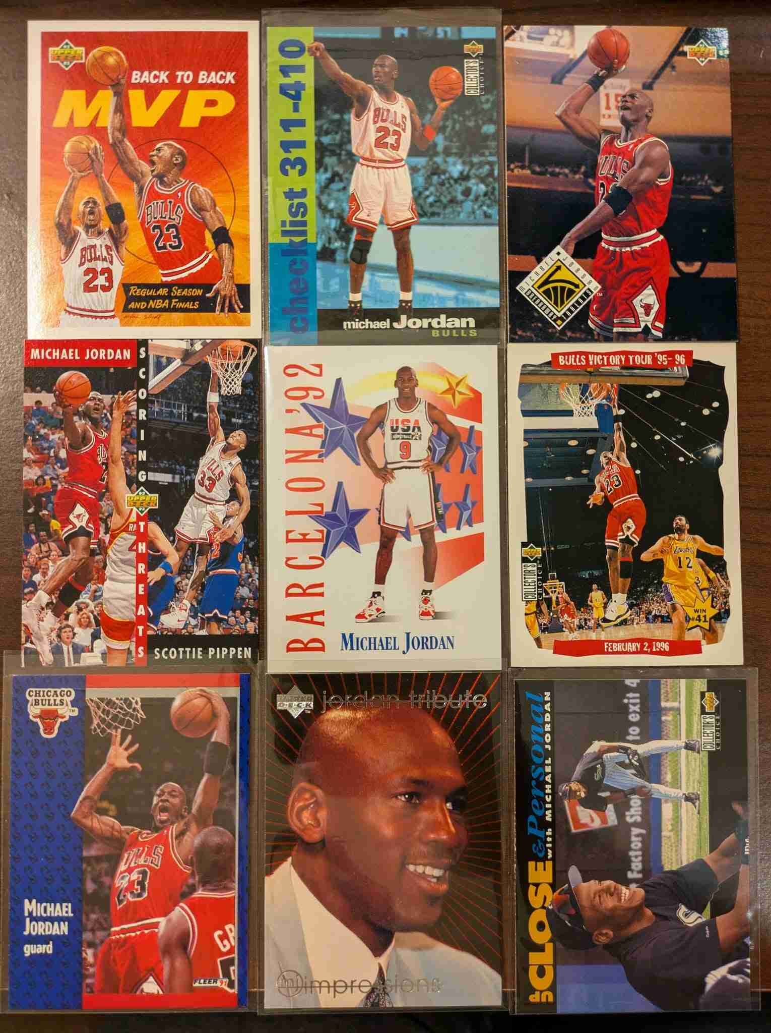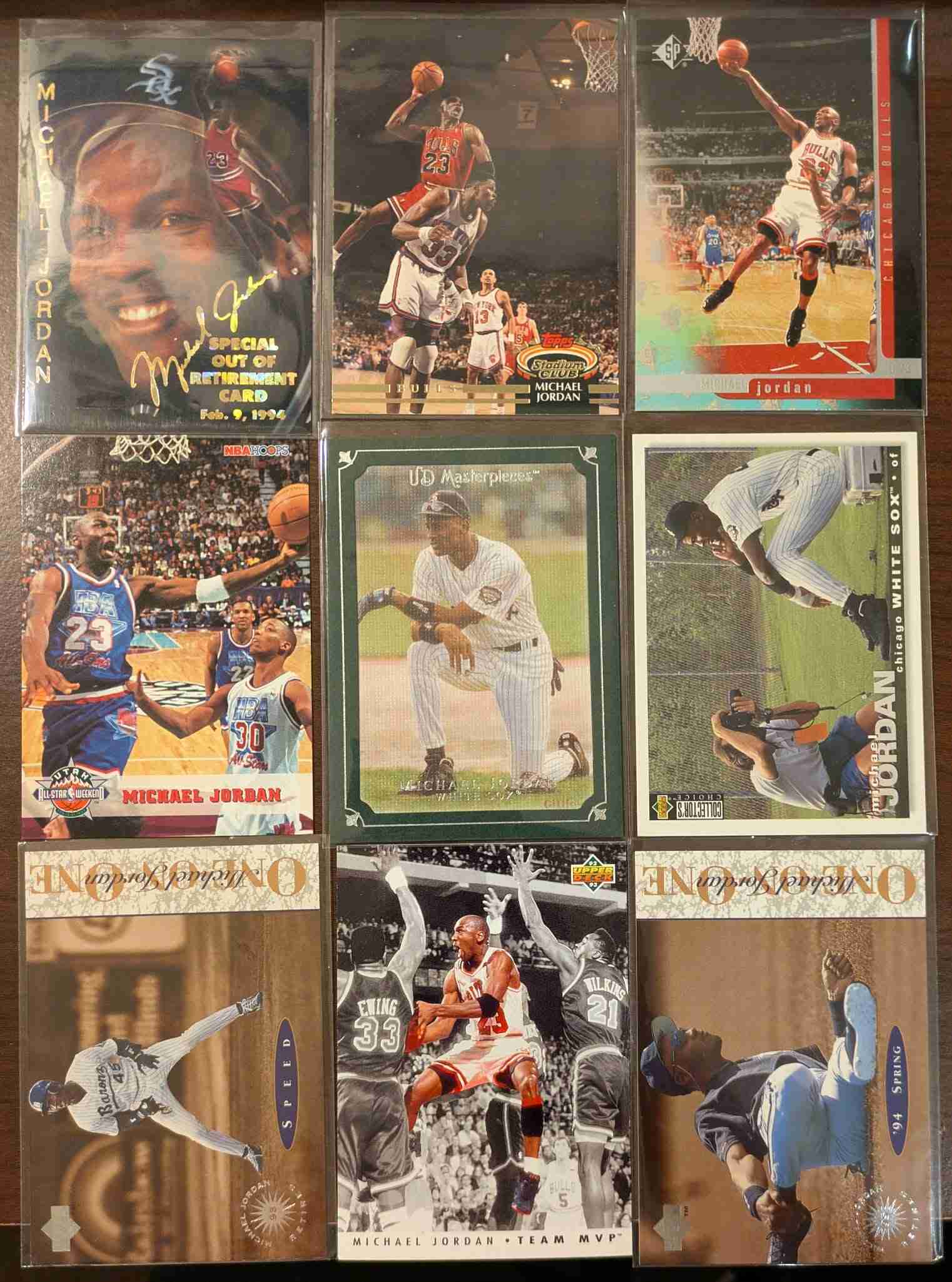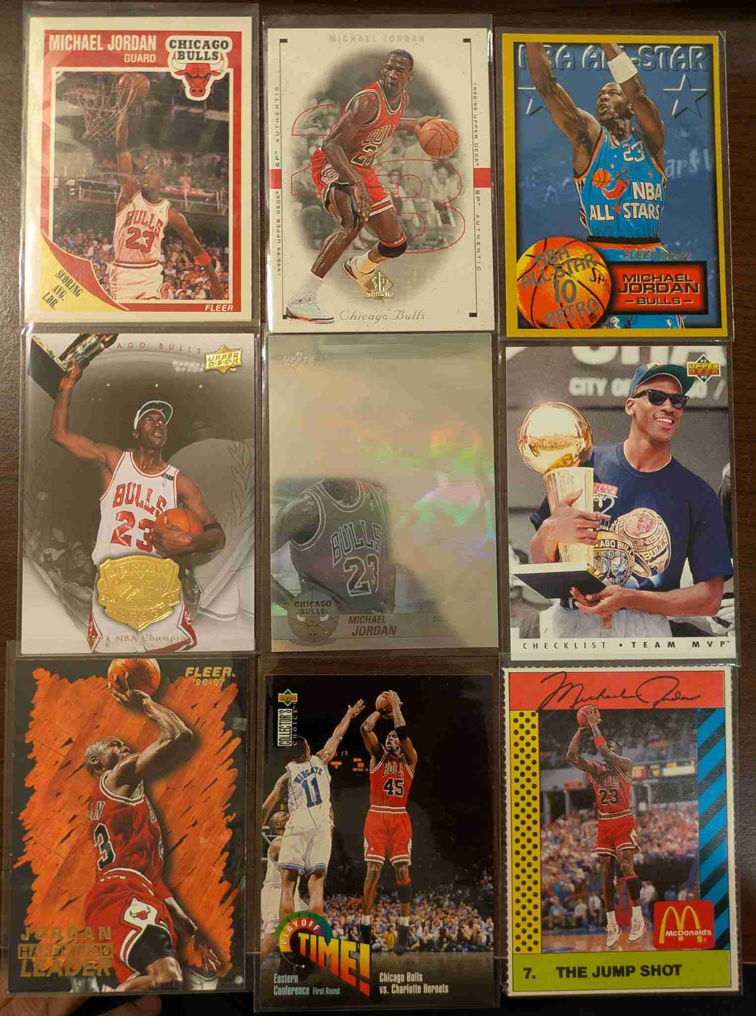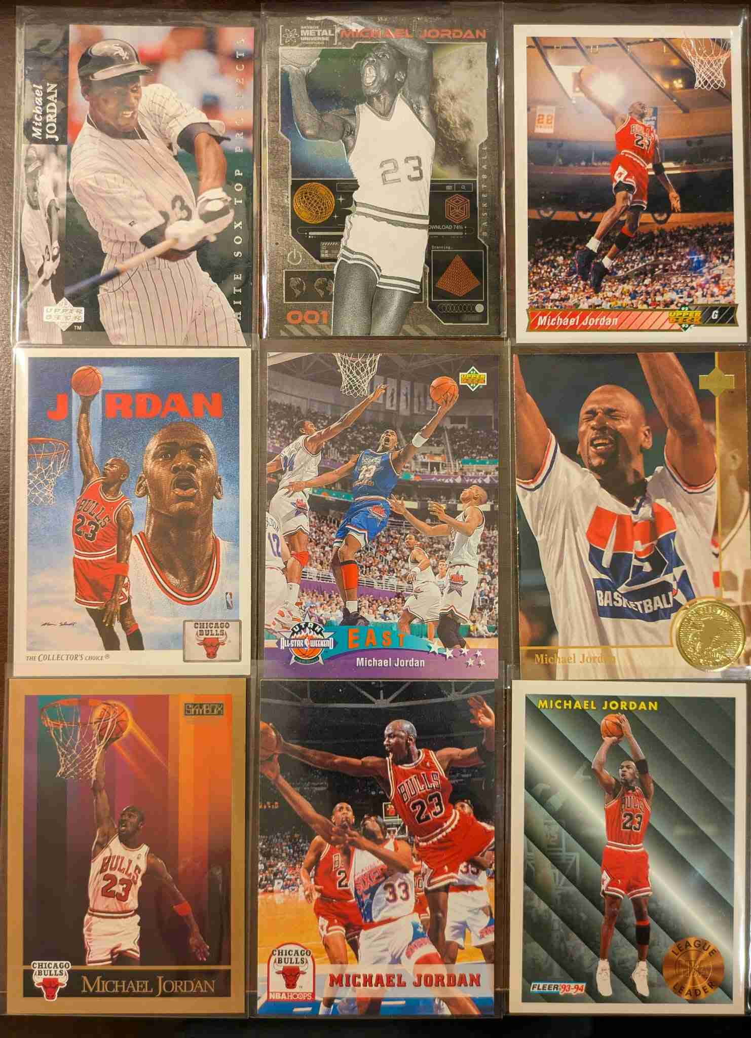 Beautiful 36 card Michael Jordan Lot. Lots of nice variety including a sweet 89-90 Fleer, a 97-98 Fleer All-Star Retro insert, 99 SP Authentic, a 92-93 UD Scoring Award holographic card, a 96-97 Fleer Hardwood Leaders insert, a 90 McDonalds card, 92-93 UD Team MVP insert, and some from his baseball career (incl. an 07 UD Masterpieces Green Linen Frame variation.