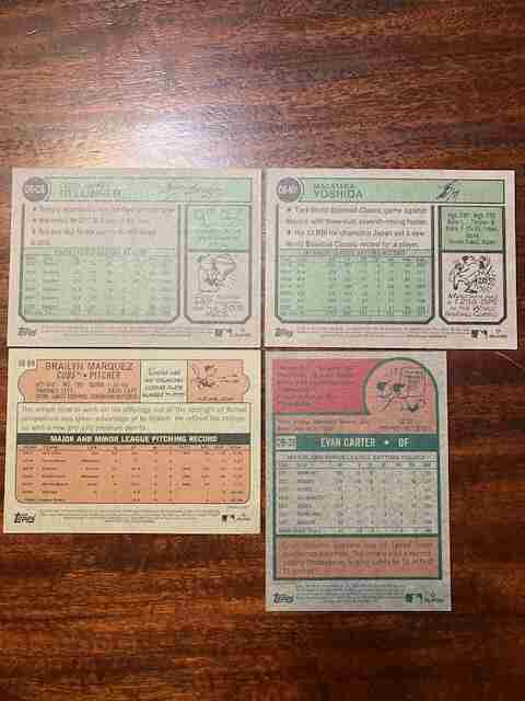 (4) TOPPS HERITAGE BASEBALL "BOX TOPPERS" (NM) 3 3/4" X 5 1/4". 2021 TOPPS HERITAGE OB-BM MARQUEZ. 2023 TOPPS HERITAGE OB=CB BELLINGER & OB=MY YOSHIDA. 2024 TOPPS HERITAGE OB-29 EVAN CARTER.