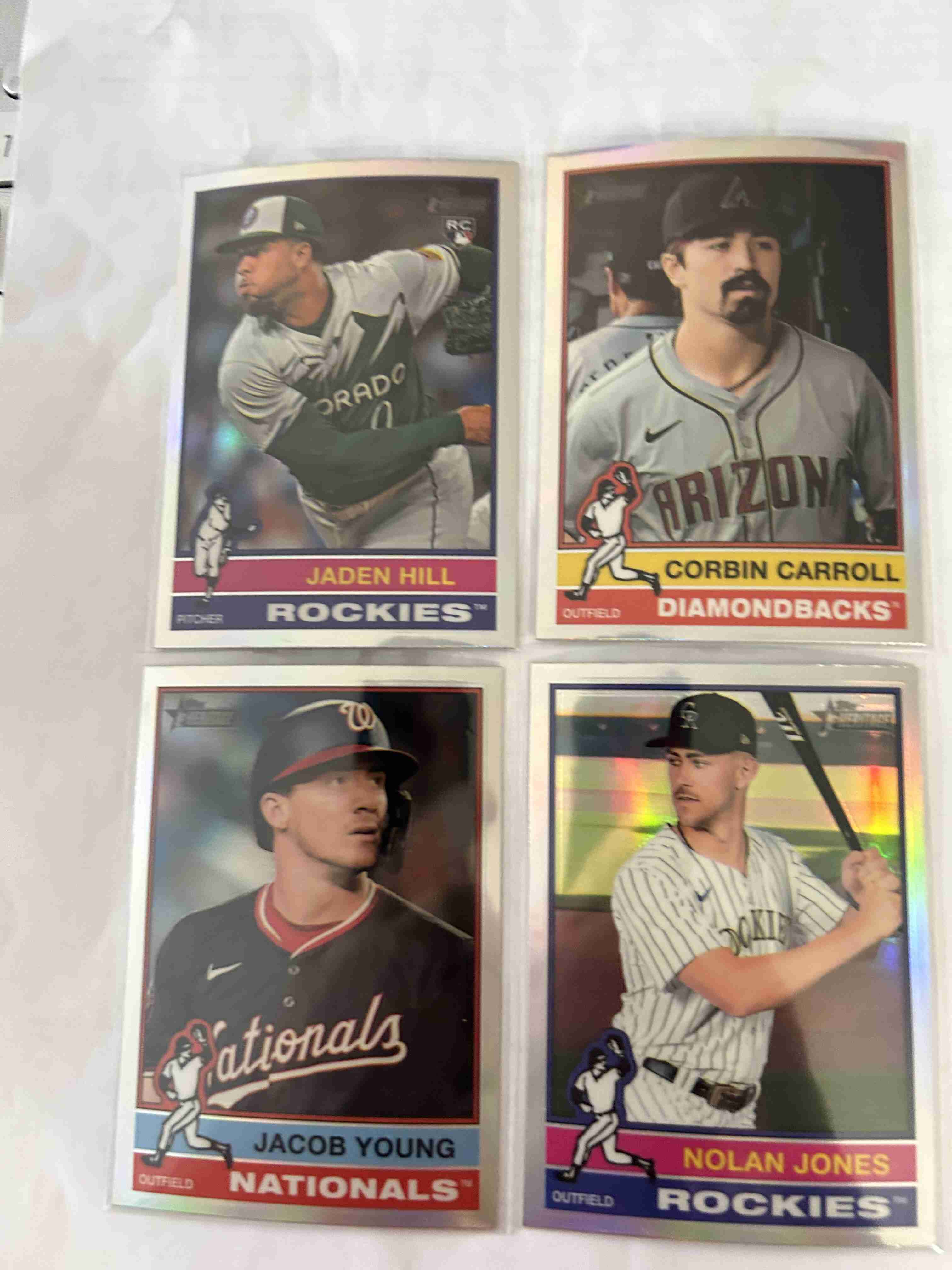 This auction is for a lot of four 2025 Topps Heritage chrome refractors. The players featured are Corbin Carroll, Jaden Hill, Nolan Jones and Jacob Young.