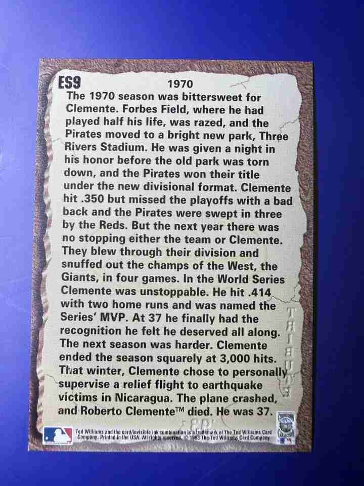 1993 Ted Williams Co. MLB #ES9 Roberto Clemente Etched In Stone