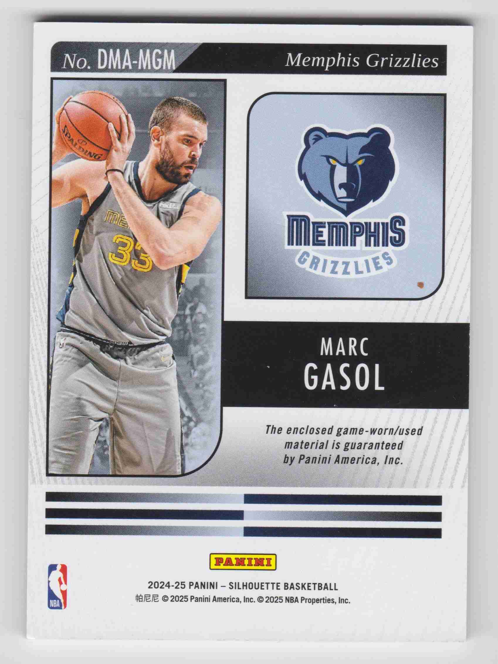 2024-25 PANINI SIHOUETTE GRIZZLLIES MARC GASOL DUAL MATERIALS GAME-WORN JERSEY RELICS