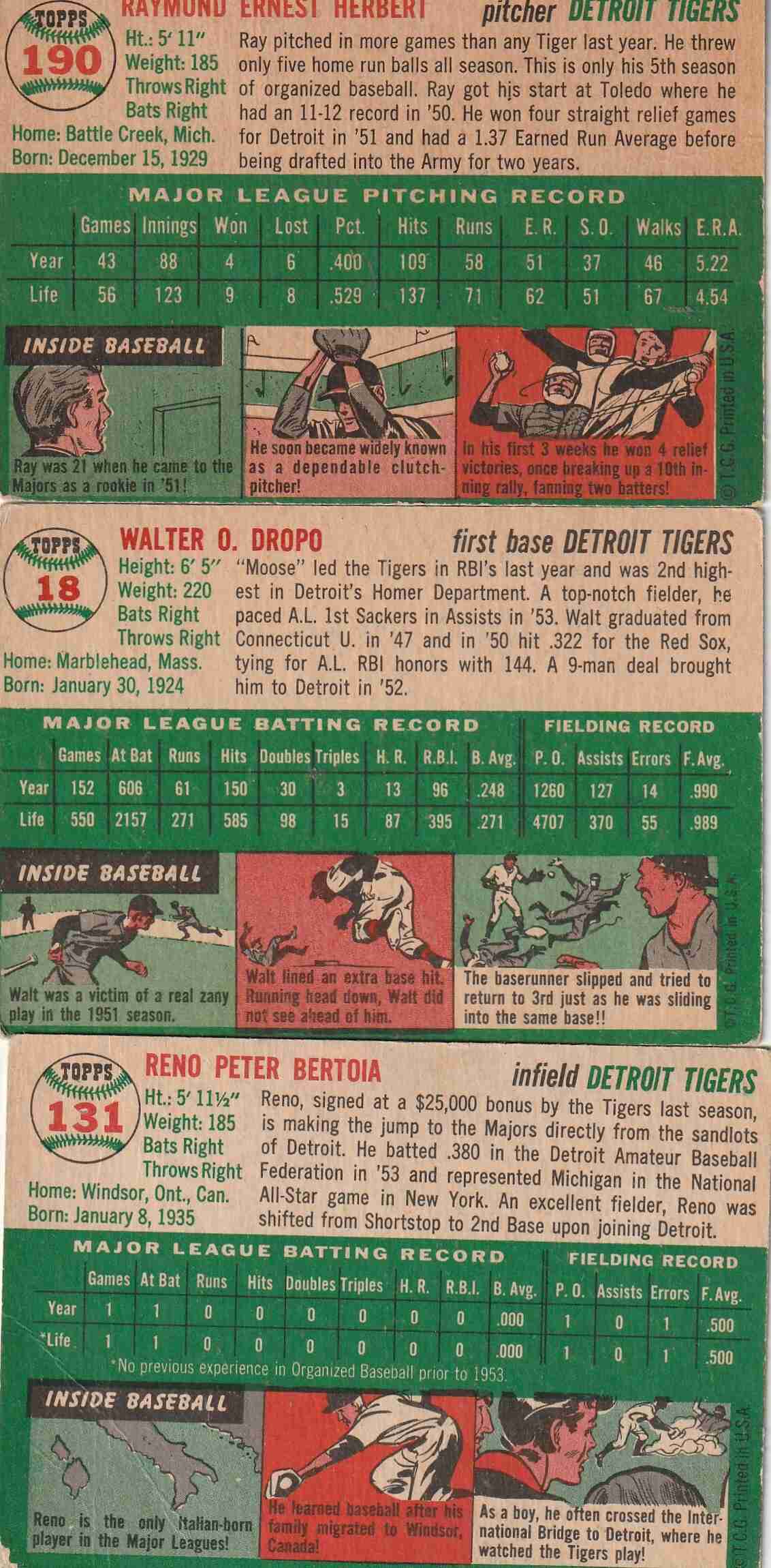 #18 Walt Dropo (EXD/EX+) all 4 corners have mild wear/soft/rounded #131 Reno Bertoia (Good-VG) lower left crease//left border wear #190 Ray Herbert (EX/EXC+) OC//mild tip wear
