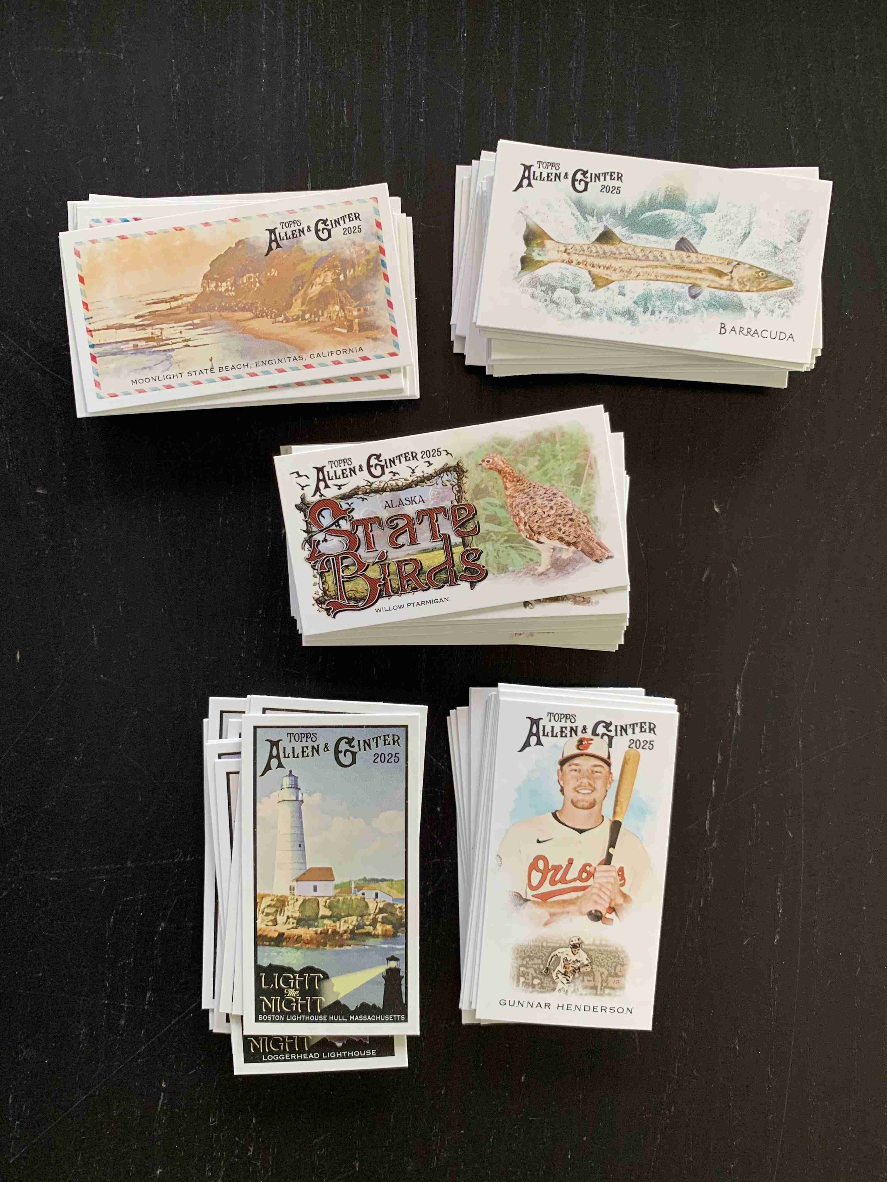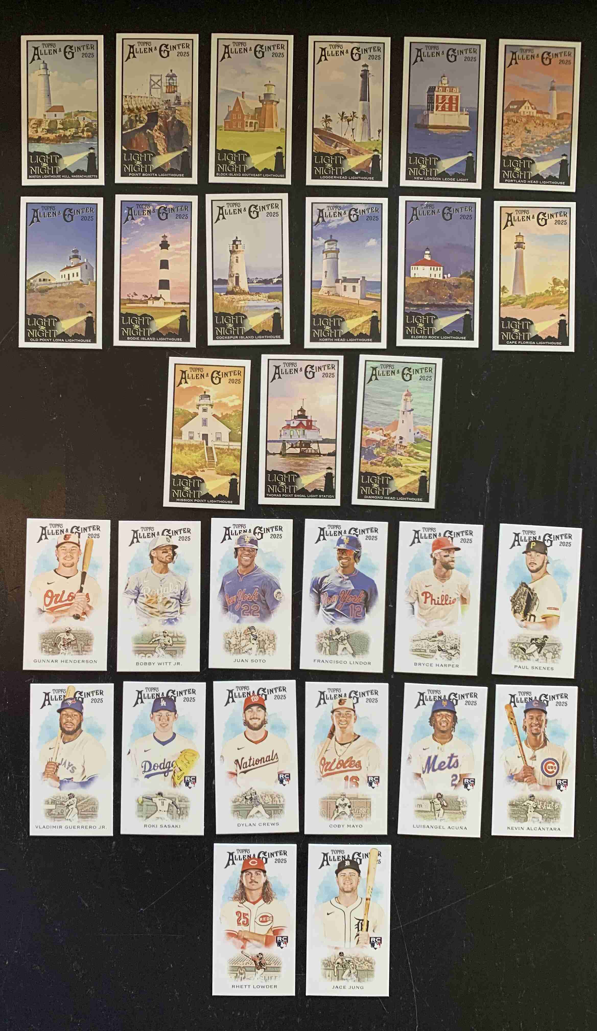 For auction is a lot of roughly 87 Mini Inserts from 2025 Topps Allen & Ginter. Lot Includes: Beachin' It - 17 Cards /50 Fish from Global Waters - 21 Cards / Light the Night - 15 Cards / State Birds - 20 Cards / N222 (Baseball) - 14 Cards. Lot has No Duplicates. Overall cards fall in the NM Range on Average; there are a few outliers that have corner/edge bumps (seems standard for minis at this point). Please refer to photos for more details. Cards ship securely via USPS with Tracking.