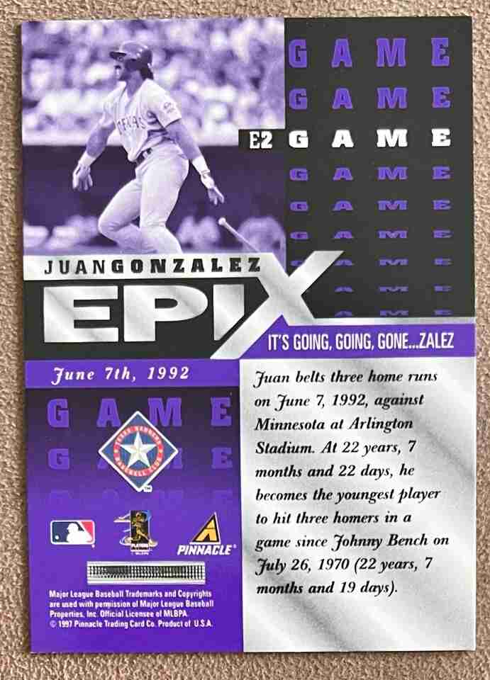 Juan Gonzalez 1997 Pinnacle Epix Purple Game #E2