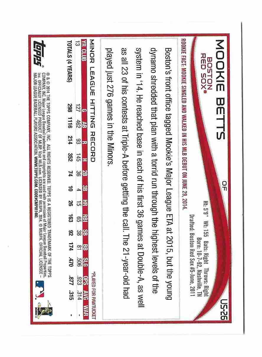 Betts 2014 Topps Update RC. Card is number US-26 in the set. Mailed in a bubble envelope. Thanks for bidding!