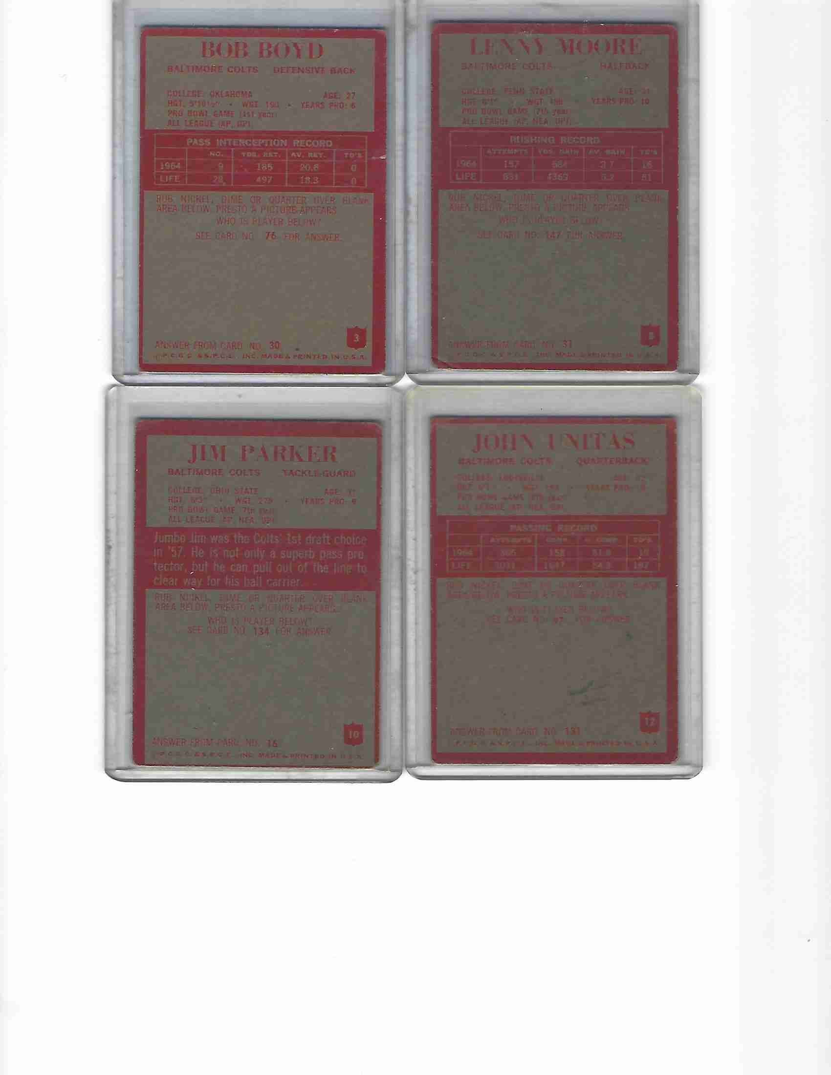 1965 TOPPS BALTIMORE COLTS 4 CARD LOT W/UNITAS