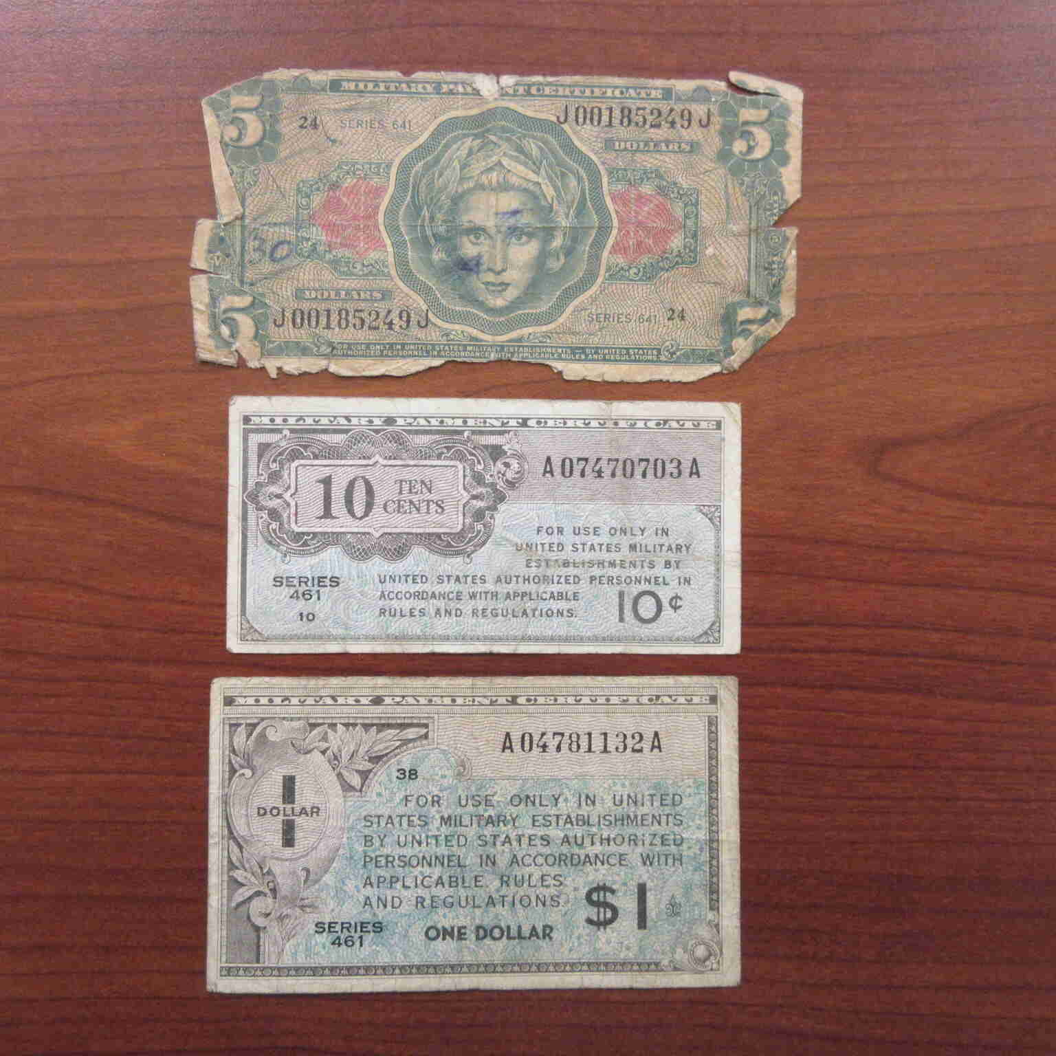 This is for (3) United States Military Payment Certificates - (1) Series 461 10 Cents (used condition), (1) Series 461 1 Dollar (used condition), and (1) Series 641 5 Dollar (very worn with pen writing in 3 places on front).