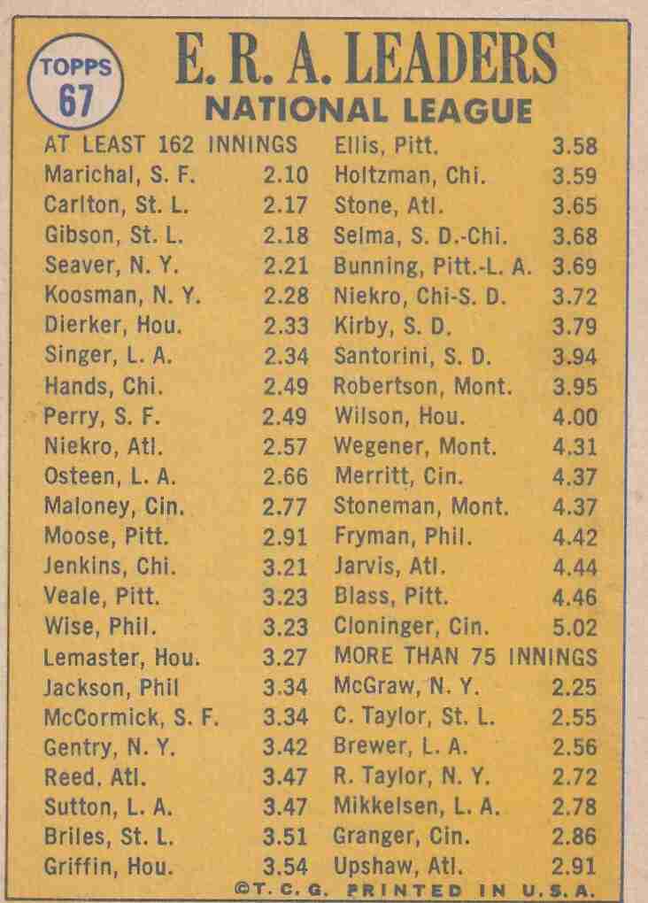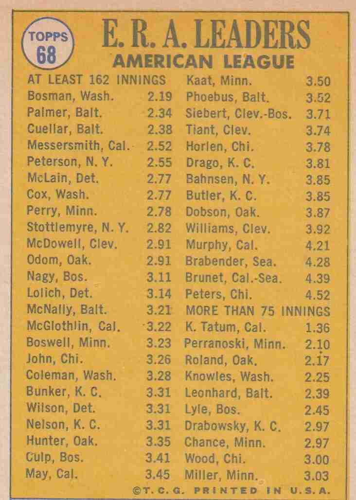 2-1970 Topps #'s 67 68 1969 AL NL ERA Leaders