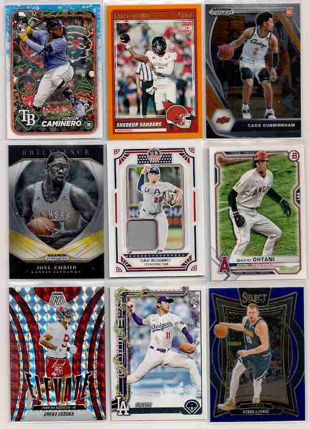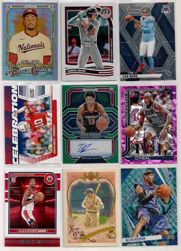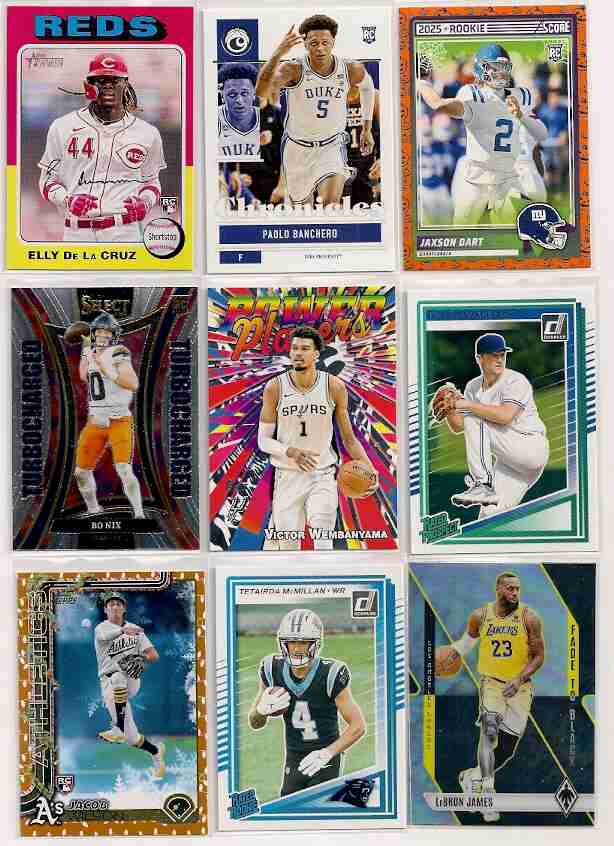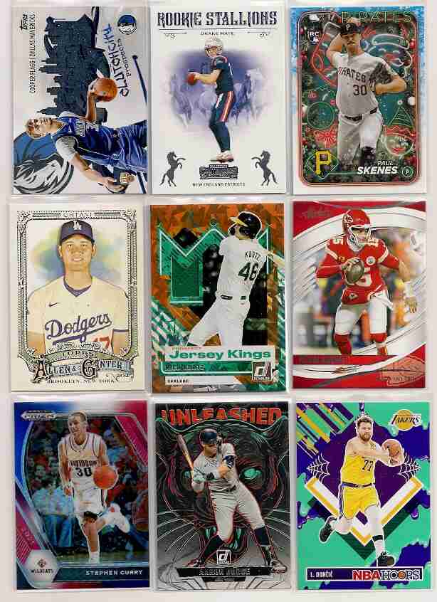 1,200 Card Lot of Baseball, Football & Basketball spanning the years from 2021 thru 2026, no doubles. The Lot has Stars, Rookies, Commons, Inserts & Parallels and consists of approximately 400 Baseball, 400 Football & 400 Basketball. Some of the Brands fround in the lot include Topps, Score, Donruss, Chronicles, Heritage and Bowman. Some of the names include Maye, Flagg, Skenes, Ohtani, Mahomes, Judge, De La Cruz, Doncic, Curry, Dart, Kurtz & Nix. Cards are near mint to mint. If payment is made within 3 days from the end of the auction, I"ll include extra 300 cards.