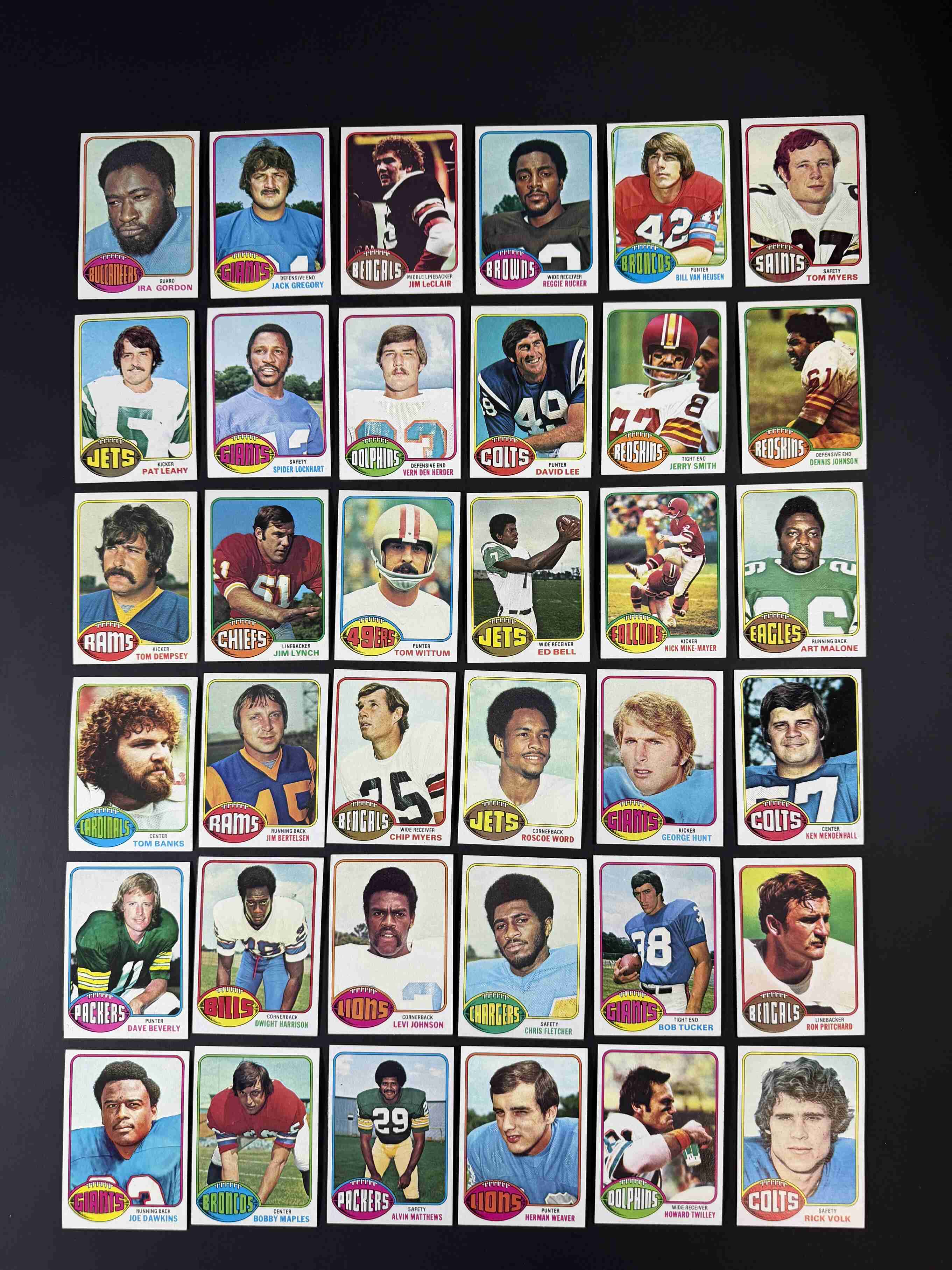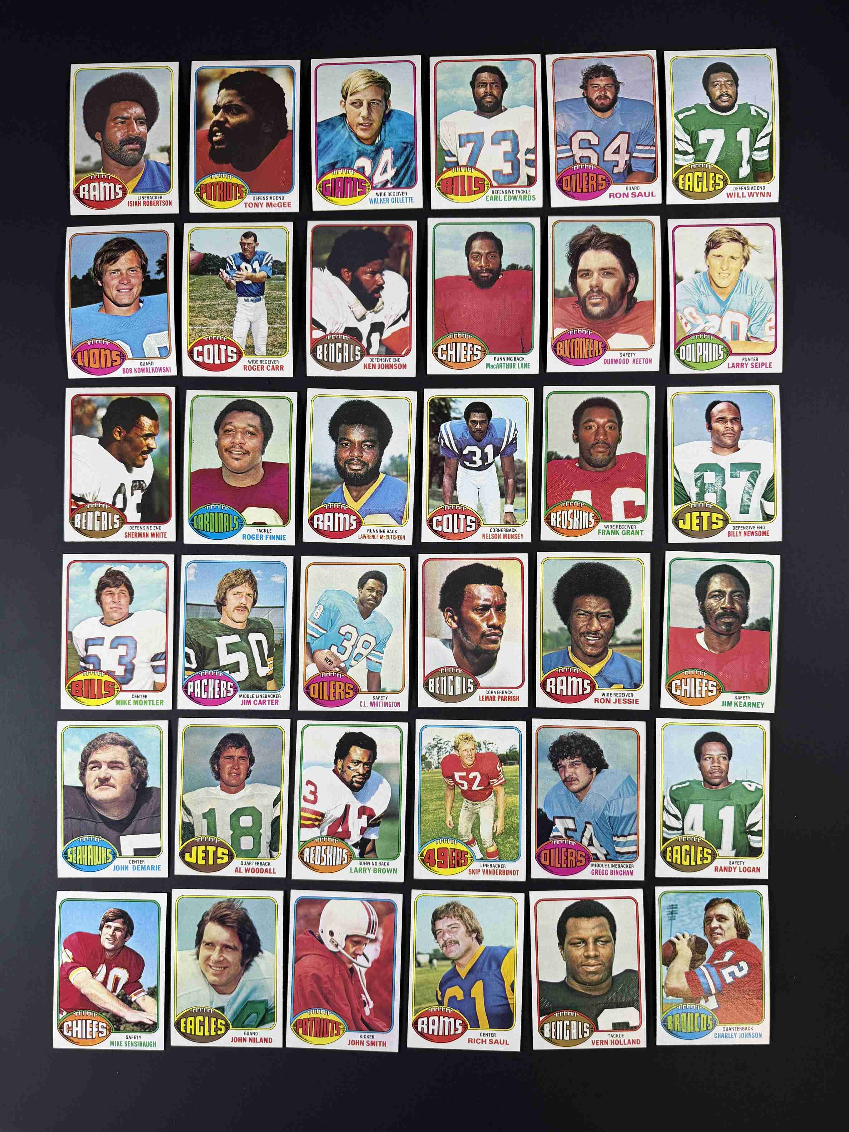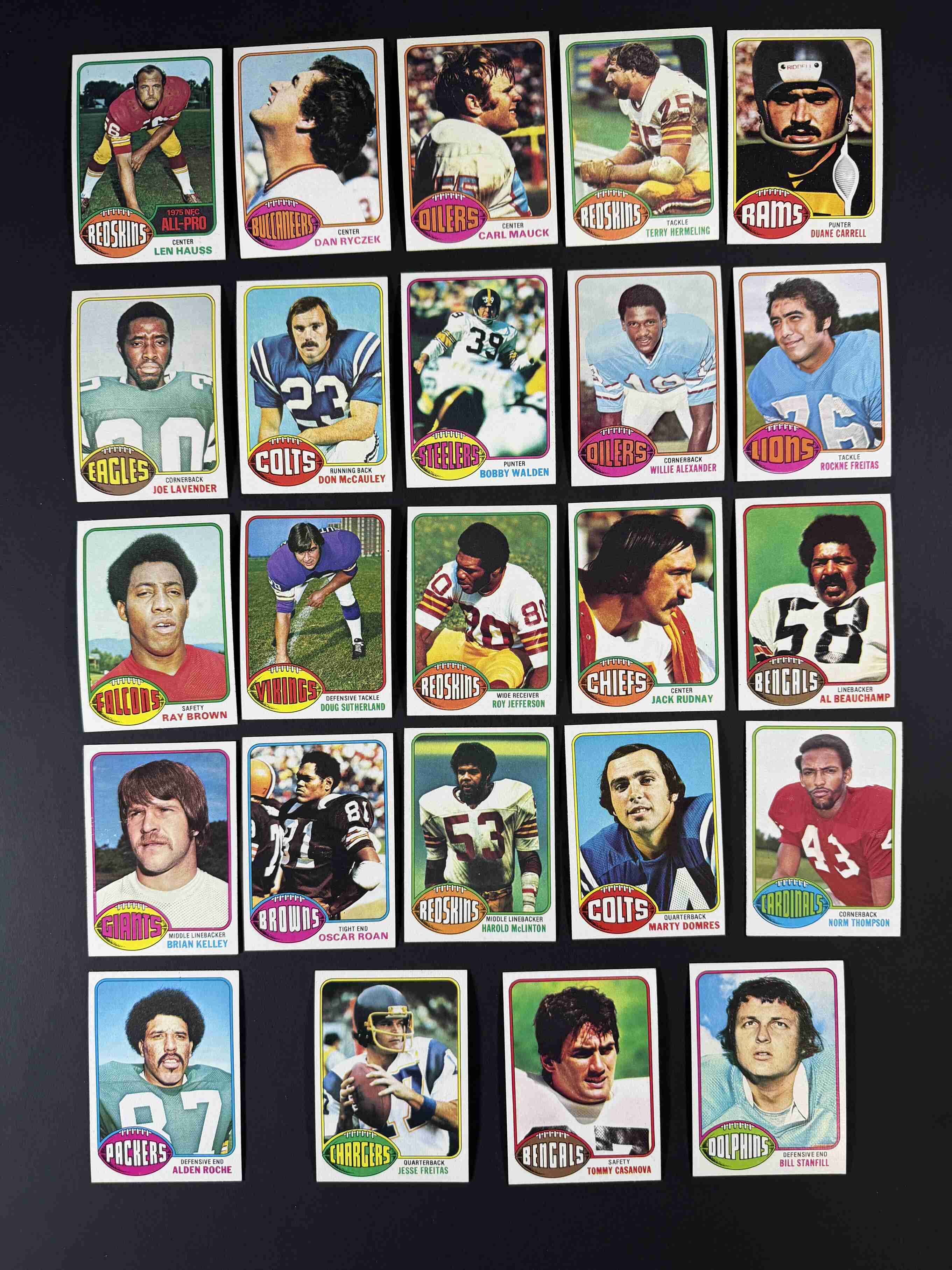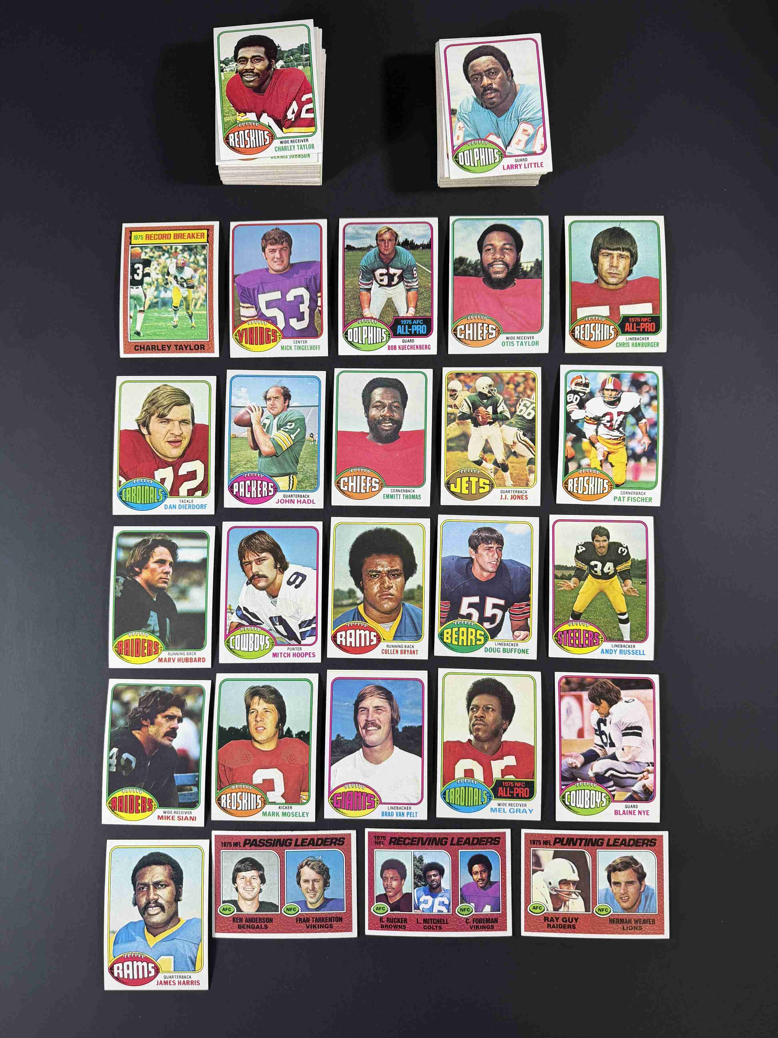 122 different 1976 Topps football cards. Condition ranges mostly from NM to MINT with a small number EX-MT. The overall grade would be a very sharp NM-MT with most having crisp corners and edges, orignal gloss and vibrant colors!
