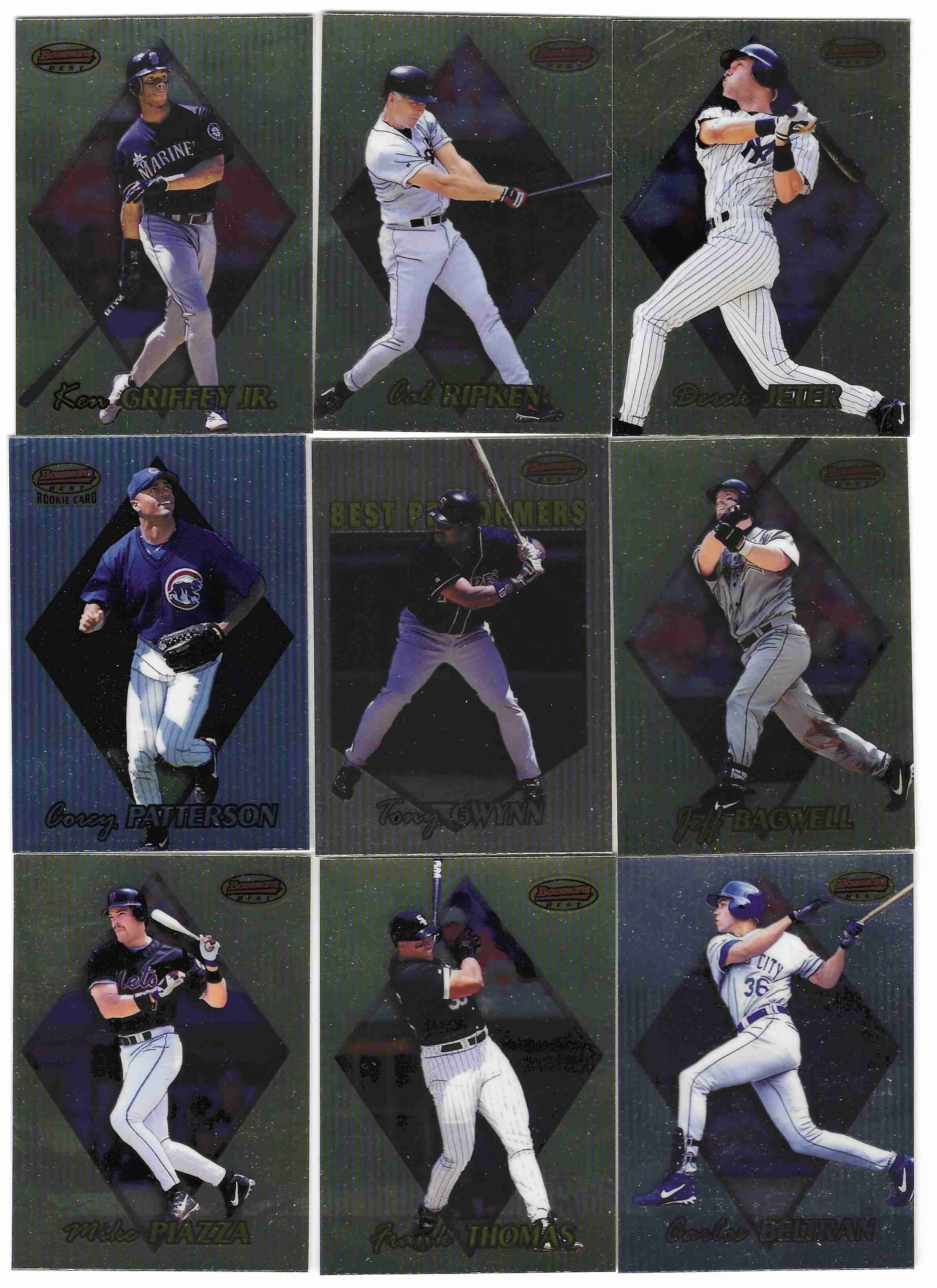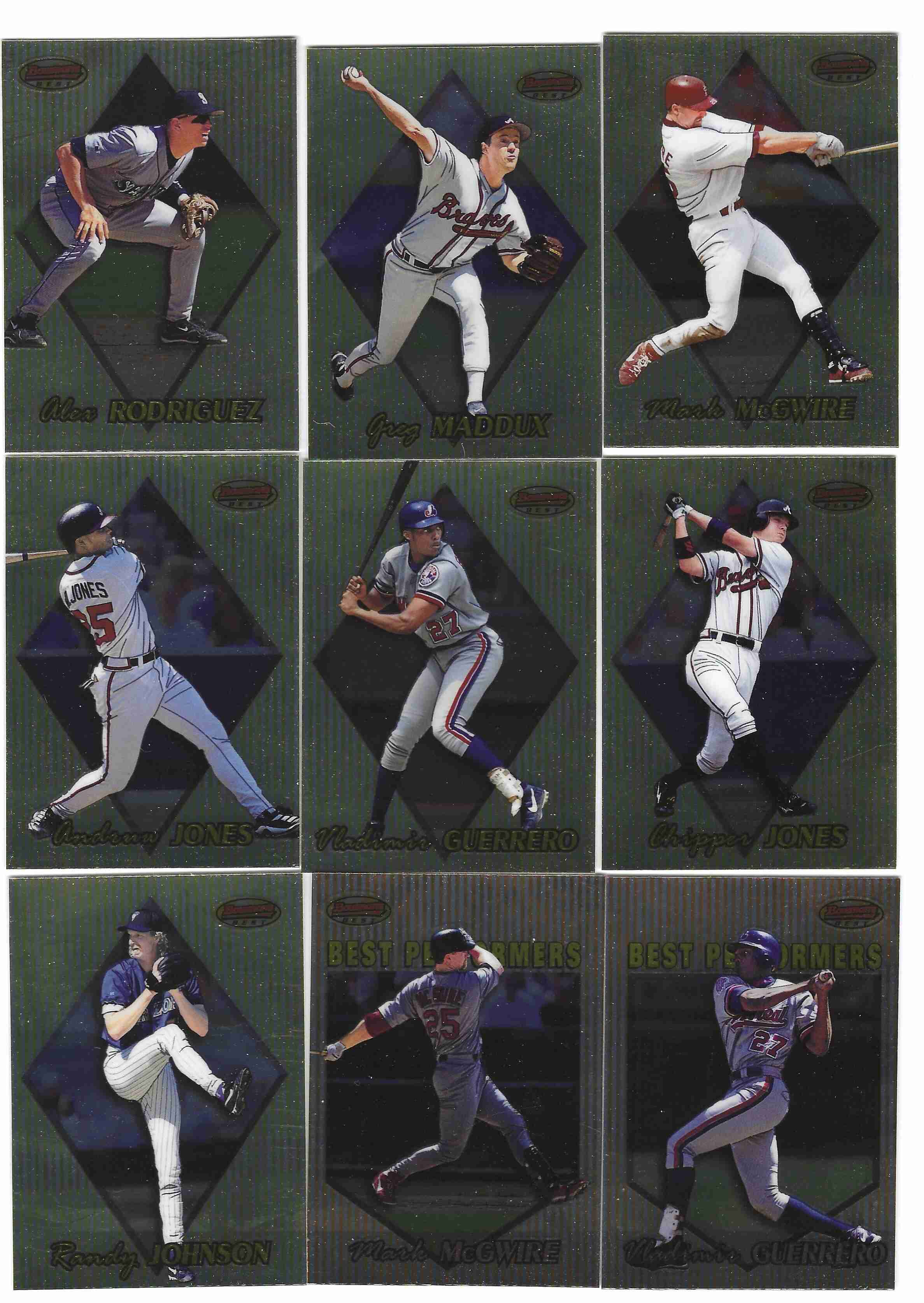 125 different Bowman’s Best. 21-Rookie Cards: C.C. Sabathia, Alfonso Soriano, Mark Mulder, Pat Burrell, A.J. Burnett, Carlos Pena, Nick Johnson, Corey Patterson, & 13 more. 25-Hall of Famers: Derek Jeter, Cal Ripken, Ken Griffey Jr., Tony Gwynn, Frank Thomas, Mike Piazza, Greg Maddux, Chipper Jones, 2 different Vladimir Guerrero, Randy Johnson, Jeff Bagwell, Andrew Jones, Adrian Beltre, Craig Biggio, Tom Glavine, John Smoltz, Wade Boggs, Jim Thome, Ivan Rodriguez, Roy Halladay, Larry Walker, Barry Larkin, Carlos Beltran, & Roberto Alomar. Other Stars: Mark McGwire, Alex Rodriguez, Nomar Garciaparra, Kerry Wood, Sammy Sosa, Roger Clemens, Jim Edmonds, Bernie Williams, Gary Sheffield, Manny Ramirez, Curt Schilling, Tim Salmon, Paul O’Neill, Jose Canseco, Juan Gonzalez, & many more. Numbers: #1-3, 4-7, 9-14, 18-20, 22, 23, 25-28, 30-38, 40, 43-51, 54, 56, 60-63, 65-68, 70-75, 77-80, 82-84, 87, 89-91, 94, 98, 101, 103, 106-108, 110-113, 116-118, 120-123, 128, 130-137, 139, 141-149, 151, 154, 155, 159, 163-165, 168-171, 174, 181, 185, 187, 189, 191, 193-195, & 198.