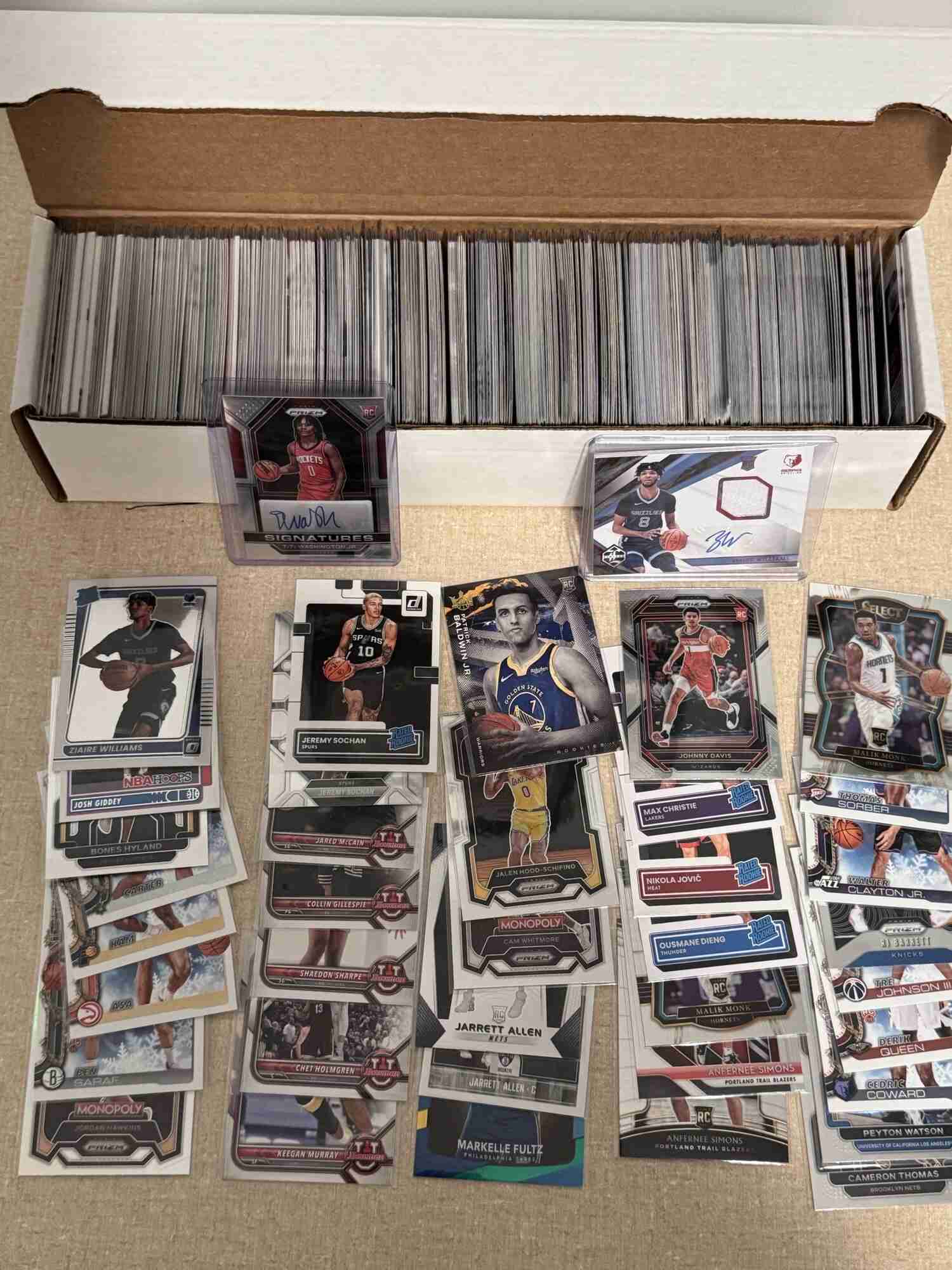 This auction is for over 460 basketball cards from 2013 to the present, though the majority are from 2020 and newer. Trying to clear out some room for new cards. All cards are in penny sleeves and ship via UPS in the box shown. The cards in this lot fall into six categories: