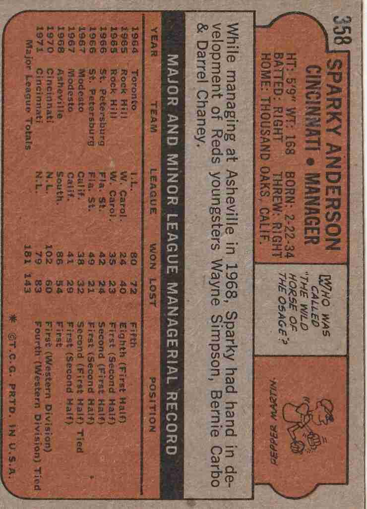 1972 Topps #358 Sparky Anderson Reds