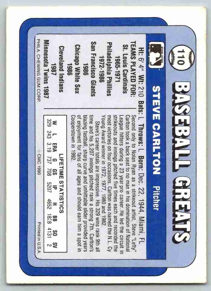 1990 SWELL BASEBALL GREATS STEVE CARLTON ST. LOUIS CARDINALS #110