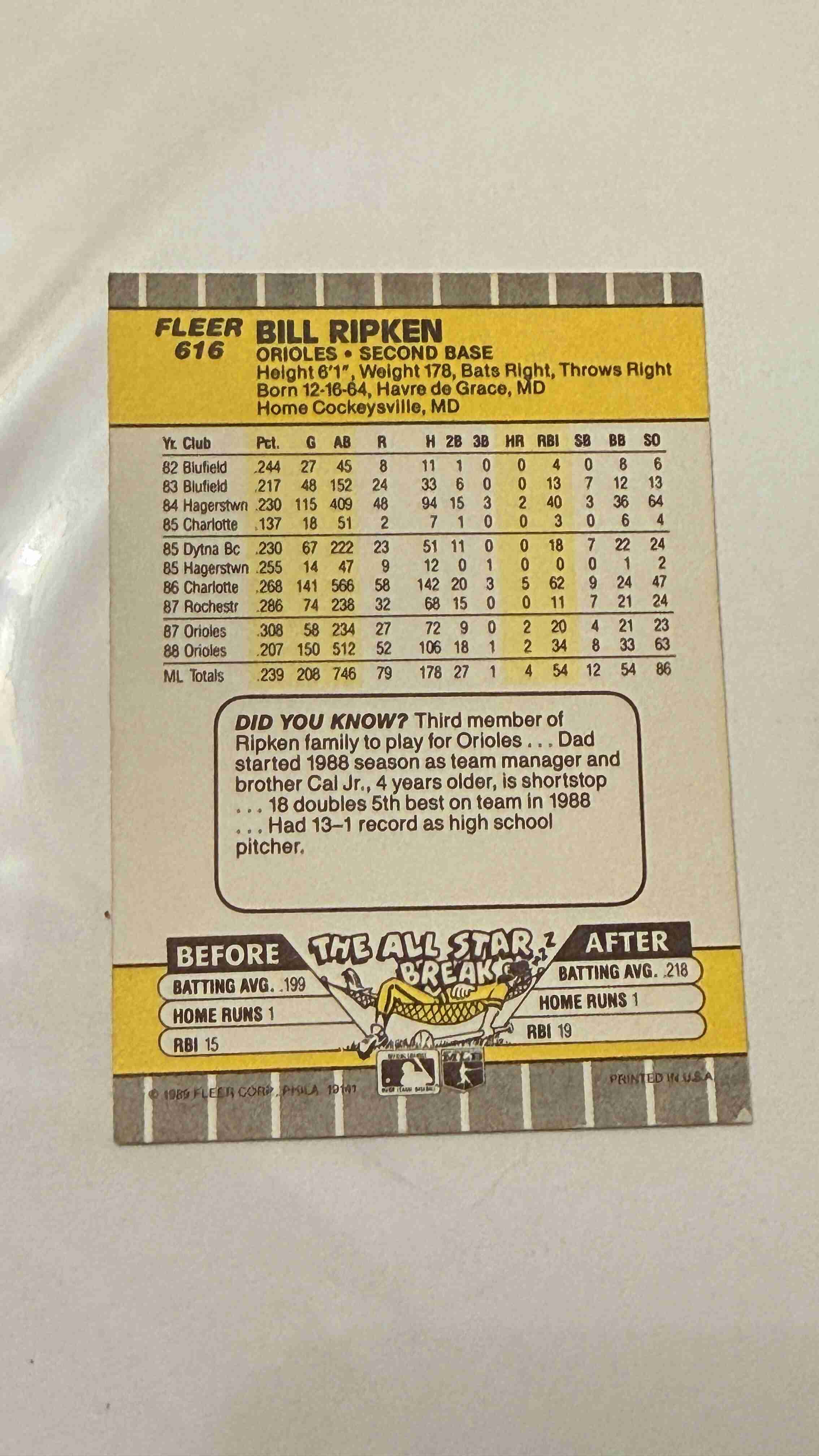 1989 Fleer Baseball Billy Bill Ripken #616 F Face FF Error Black Scribble SSP