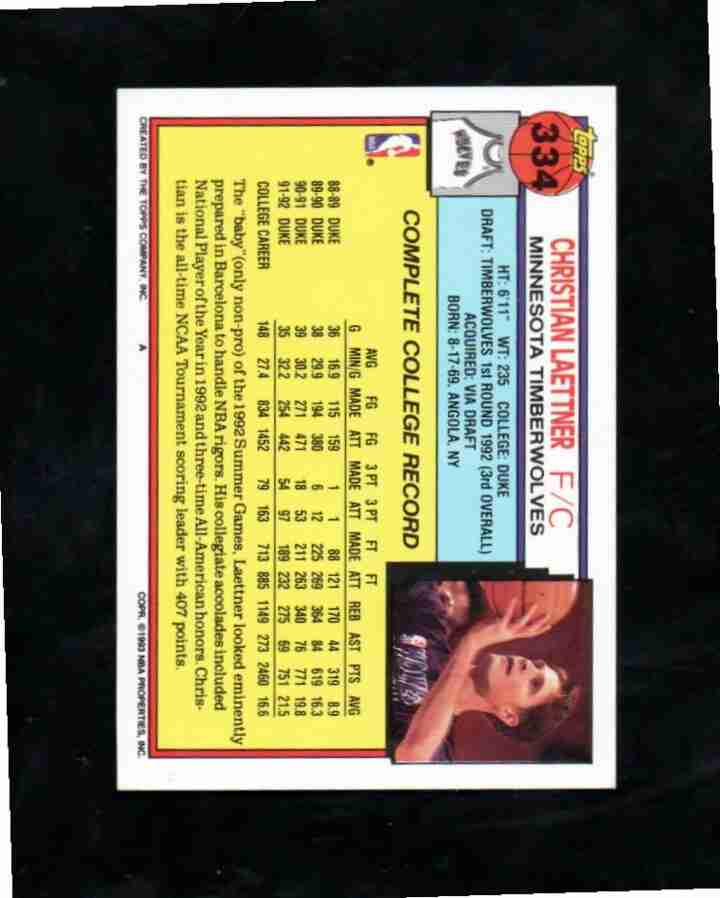 1992/93 Topps # 334 CHRISTIAN LAETTNER Minn. Timberwolves