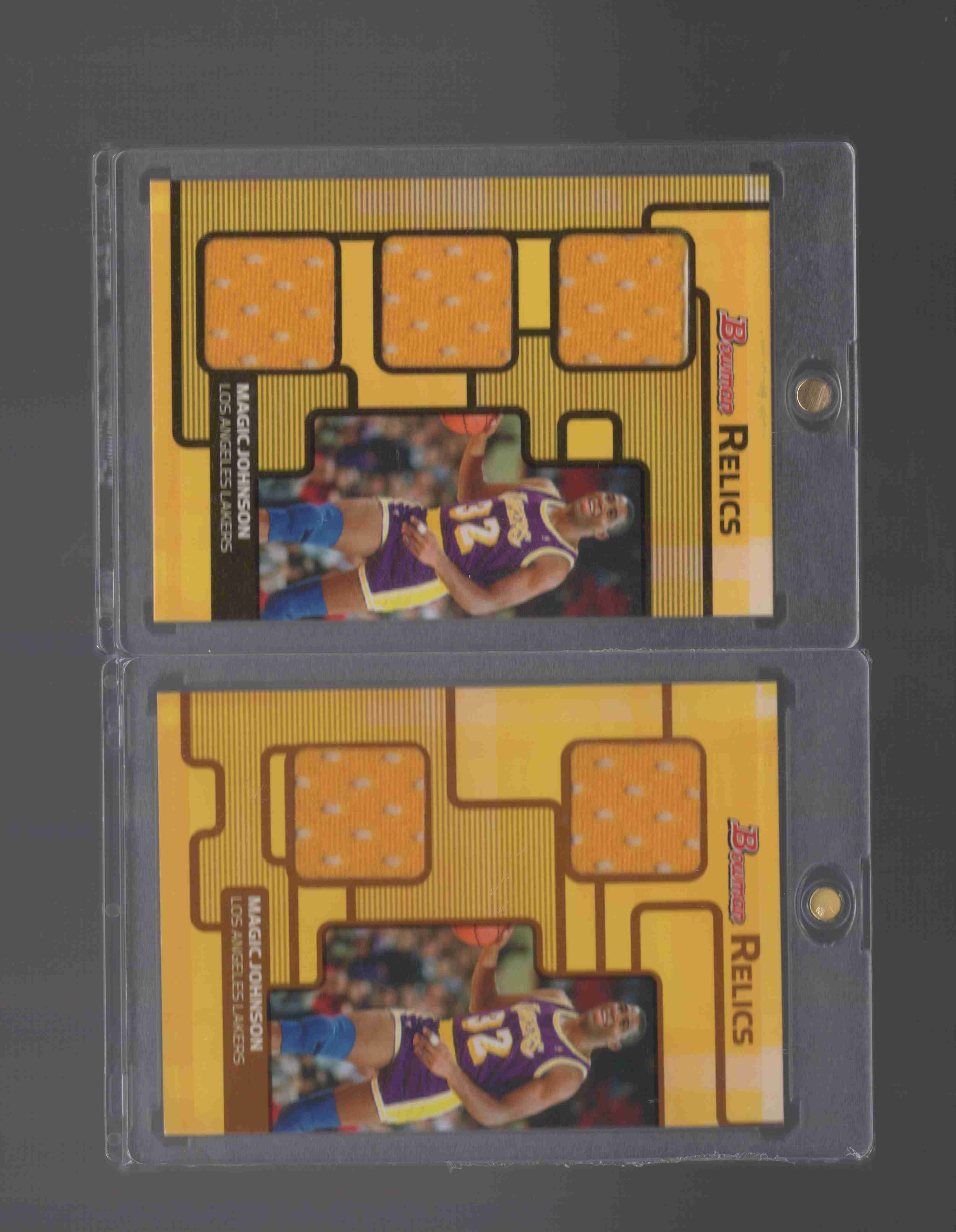 Lot of 2 2007 Bowman Magic Johnson Relic Cards. Dual Relic Serial numbered 18/50 and Triple Relic numbered 98/99!. Ships bubble mailer with tracking. Check out our other items to help with shipping costs per item.