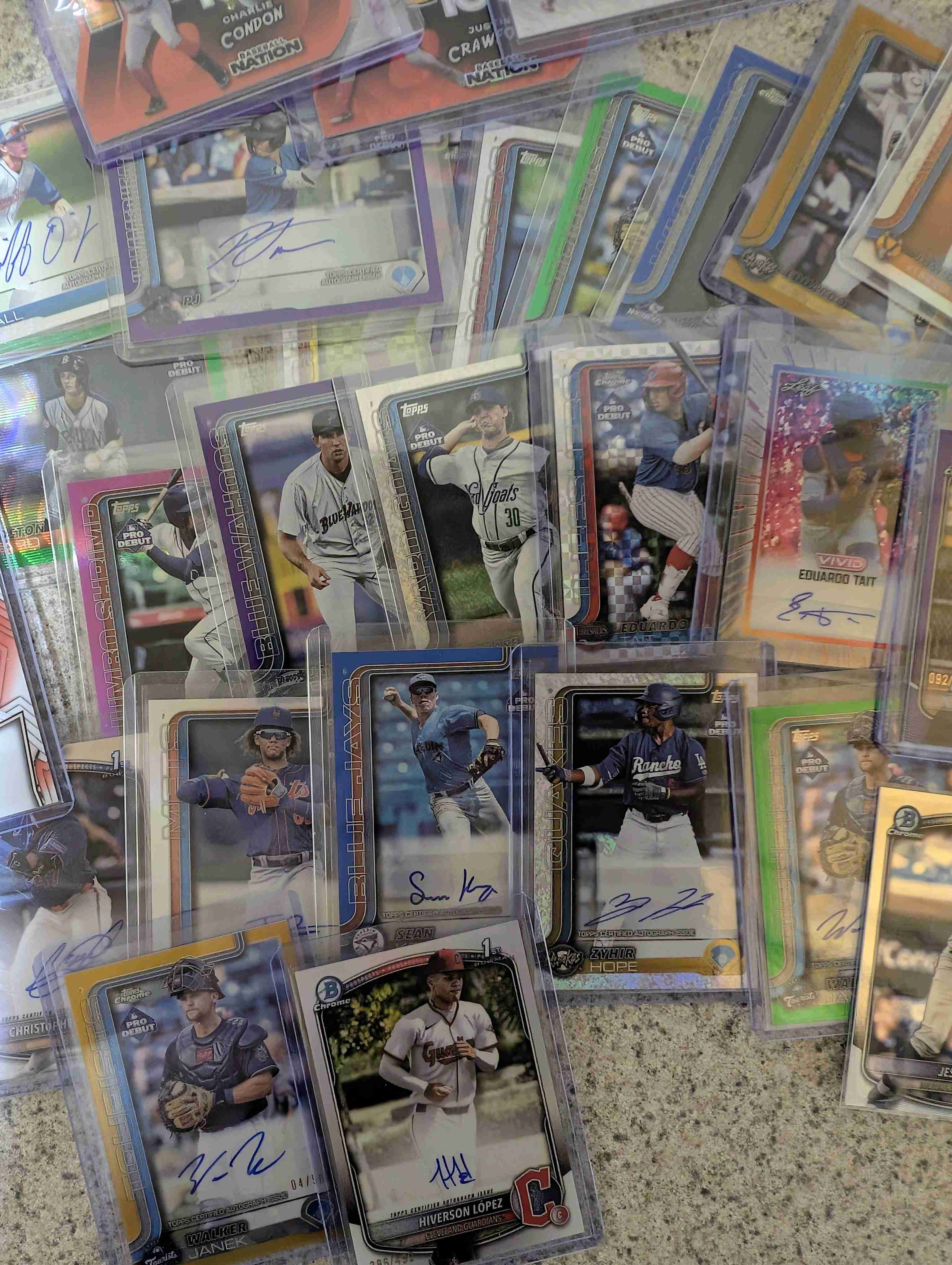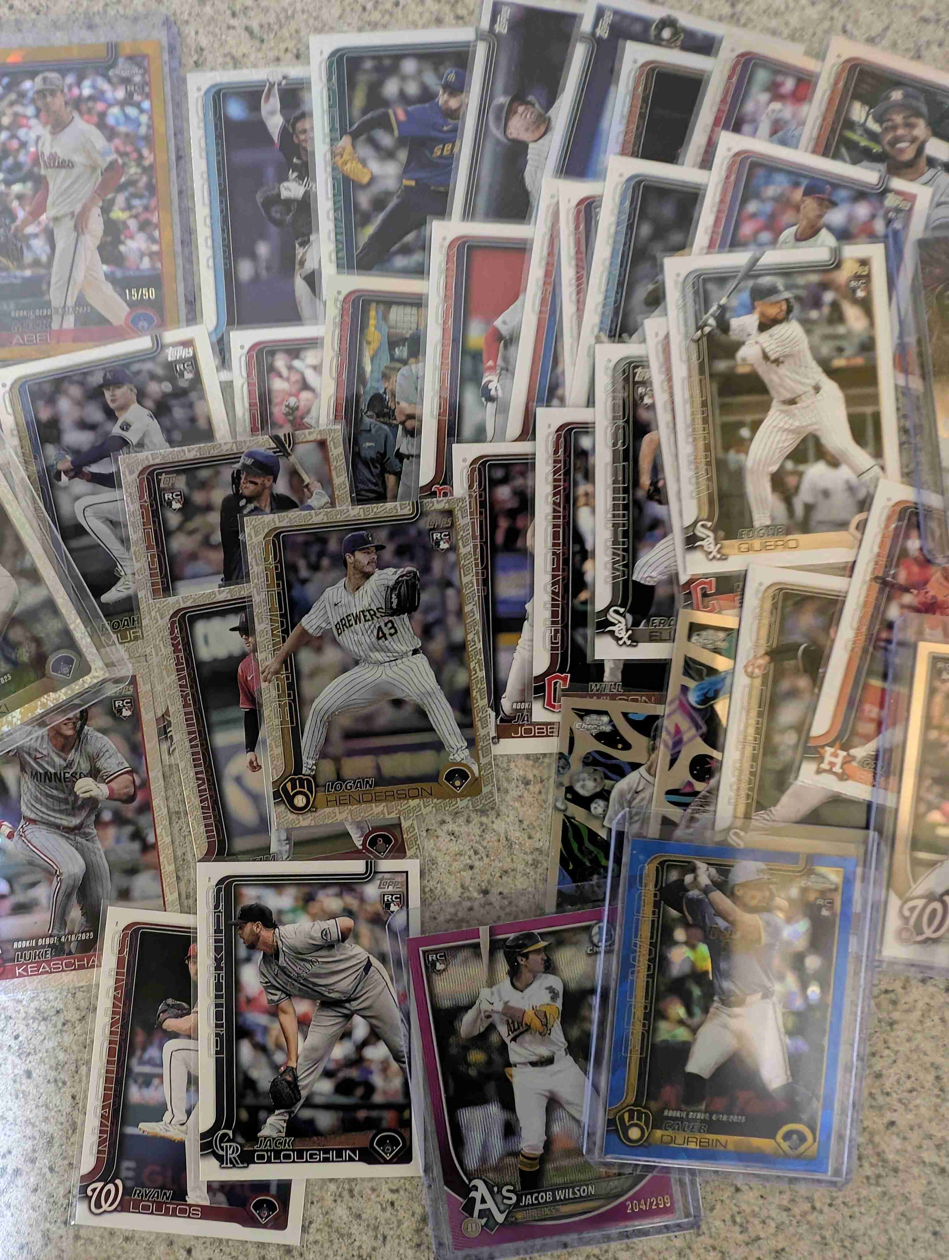 THIS AUCTION IS FOR A 340+ CARD LOT OF BASEBALL AND FOOTBALL ROOKIES AND PROSPECTS. SOME STARS INCLUDED. BASEBALL CARDS FROM BOWMAN CHROME, TOPPS CHROME, TOPPS PRO DEBUT, SAPPHIRE, LEAF. FOOTBALL FROM BOWMAN CHROME U, PANINI PRIZM, OPTIC, MOSAIC, ABSOLUTE. ALL '24-'25. 100+ BOWMAN U, 1ST BOWMAN CARDS. MENDOZA, STOCKTON, MATEER, UNDERWOOD, ROBERTSON, STONE, GRONOWSKI. 4 AUTOS. AVERY JOHNSON. 8 #'D. ALTMYER, LOCKE, GRONOWSKI, REED. 8 REFRACTORS. 30+ PANINI FB ROOKIES. JEANTY /75, JEANTY /275, BOWERS, DART, LOVELAND, VARIATIONS OF MILROE, JEANTY, JUDKINS. BRIAN THOMAS PATCH, CAM MILLER AUTO. BOWERS /99, TJ WATT /15. AMON-RA SILVER PLUS MORE. 11 BASEBALL PROSPECT AUTOS. JANEK /50, HOPE /175, KEYS /150, TAIT /3. 15 SERIAL #'D. QUINTERO /50, CLARK /150, CONDON /4, CRAWFORD /4, TAIT /15, COLLIER /1. RED ROOKIES OF DINGLER, WILSON, HENDERSON. 50+ ROOKIES. ABEL/50 (SAPPHIRE), WILSON /299, WOOD, CREWS, JOBE, SHAW, JUNG, KEASCHALL, RUSHING. MANY OF THEM LOGO FOIL. 25+ STARS/NON-BASE. CROCHET, PCA, SOTO, WHITT JR, OHTANI, BETTS, HARPER, SKUBAL, JUDGE.