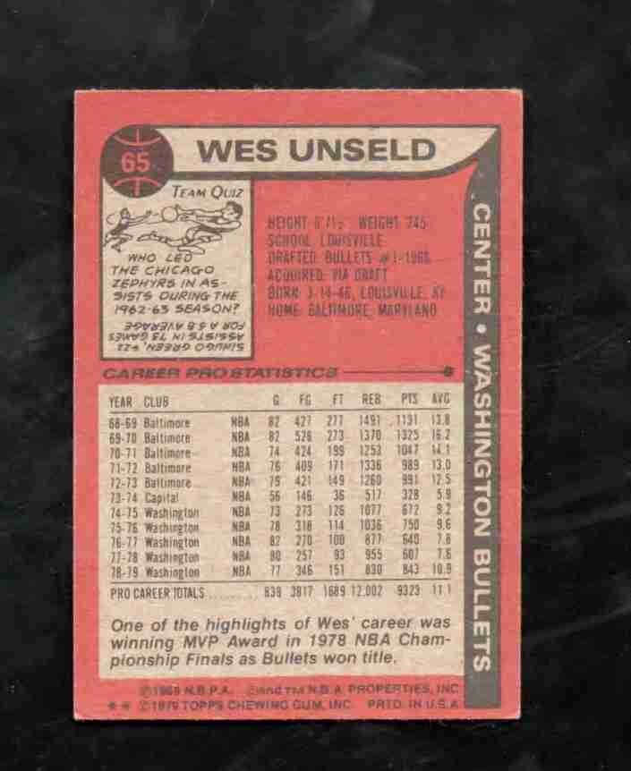 1979/80 Topps # 65 WES UNSELD Washington Bullets