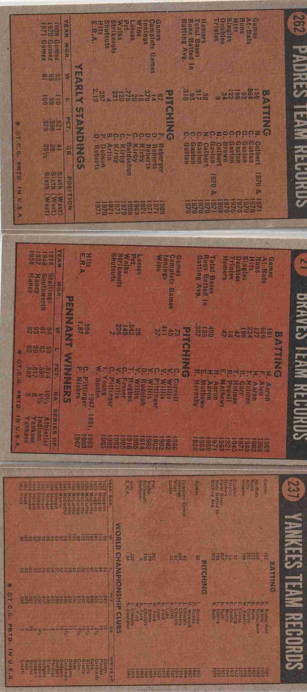 #21 Braves (EX+/Better) #237 Yankees (EX/NM) #262 Padres (EX/NM) ***marks on first team card are from a spot on scanner screen (sorry)