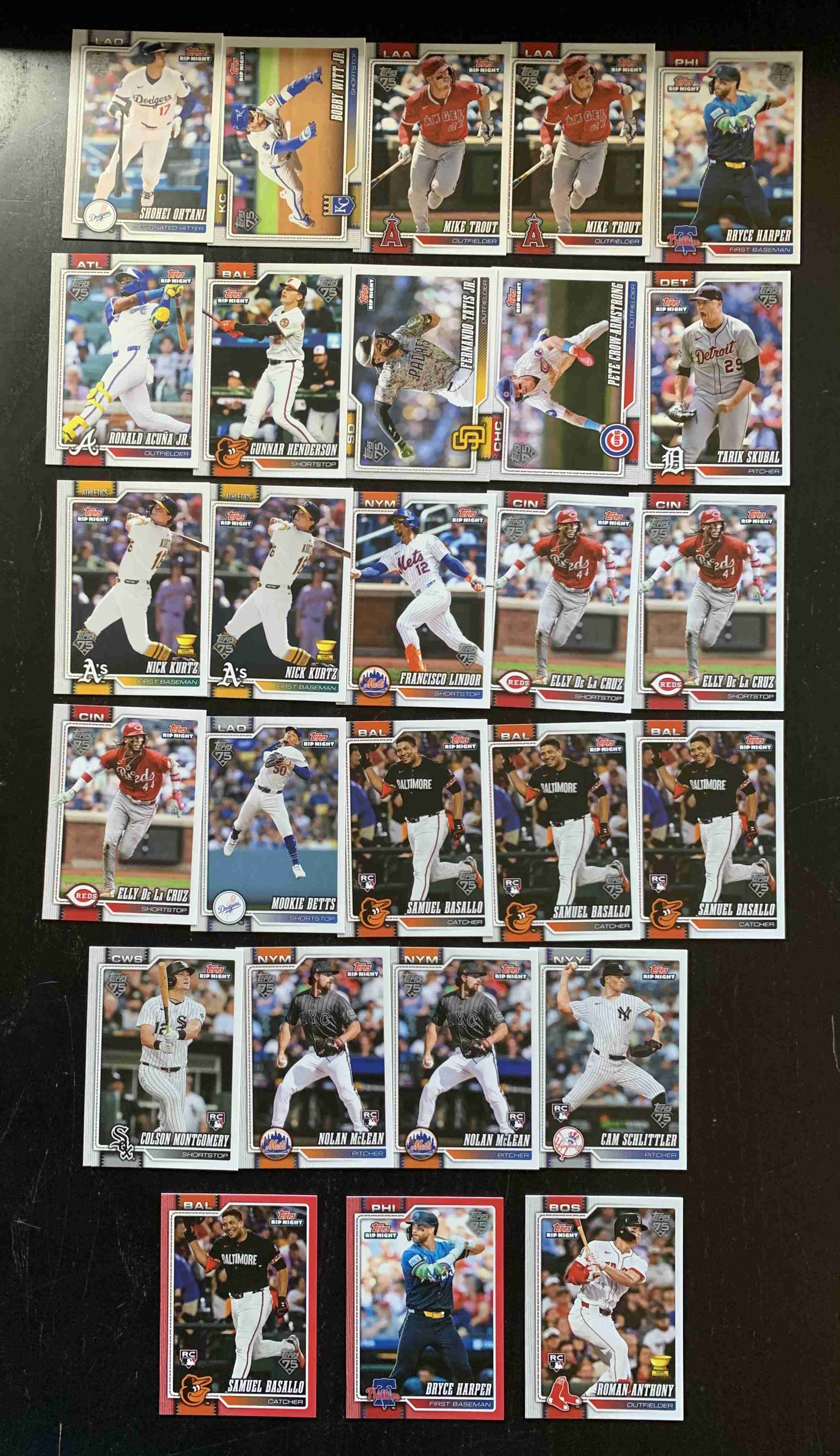 For auction is a lot of 27 Cards from the 2026 Topps RIP NIGHT PACKS, Only Given Away at Shops on One Day. Lot includes a mixture of Stars, Rookies and a Couple of Parallels. Lot does contain multiples. Every Card in the photo is included. Overall Cards are NM or better, though there may be outliers. Please refer to photo for more details. Cards ship securely with tracking via USPS. Be sure to check out my other Items, including other 2026 Topps Lots and Sets!