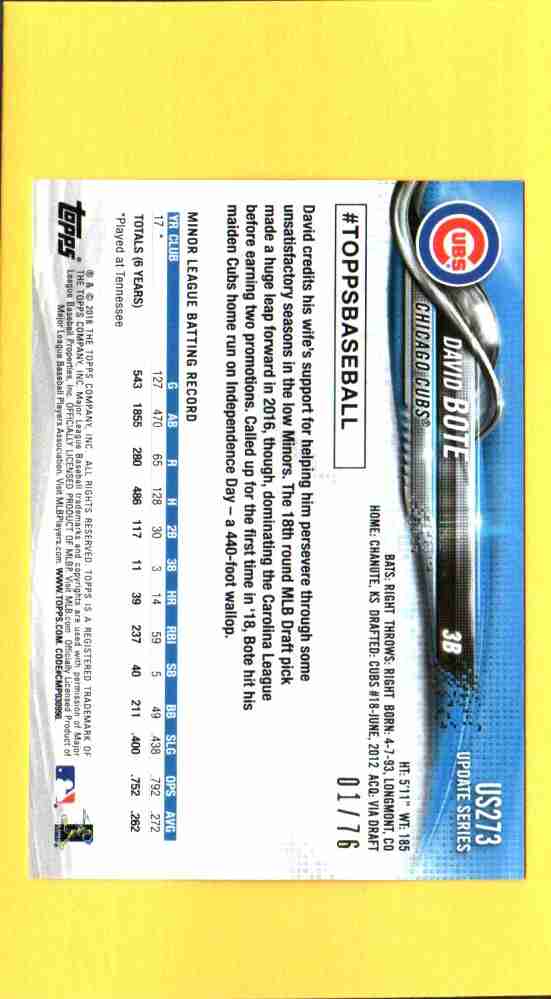 David Bote 2018 Topps Update Independence Day RC #US273 /76 – Low Serial 01/76 – Cubs Rookie