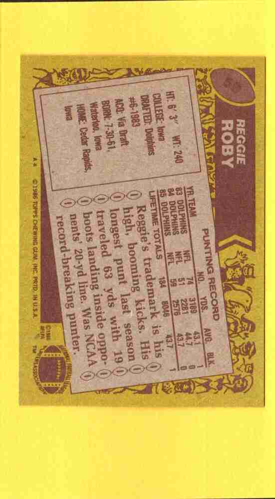 1986 Topps Reggie Roby #59 Miami Dolphins – Vintage NFL Car