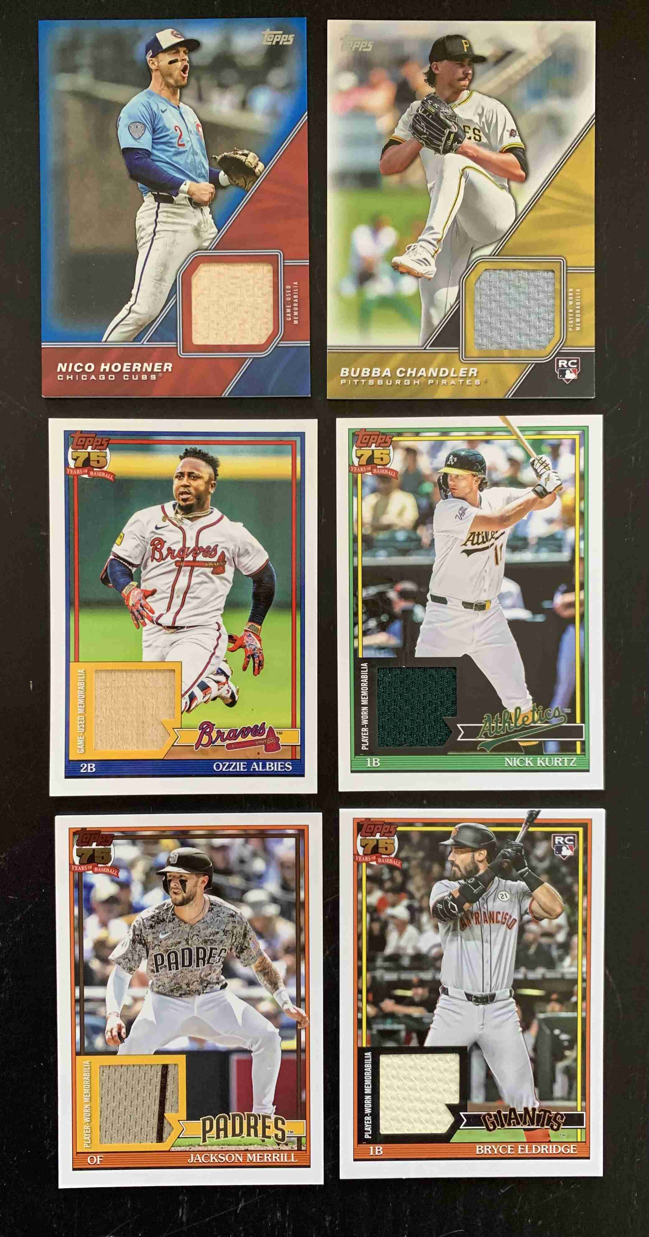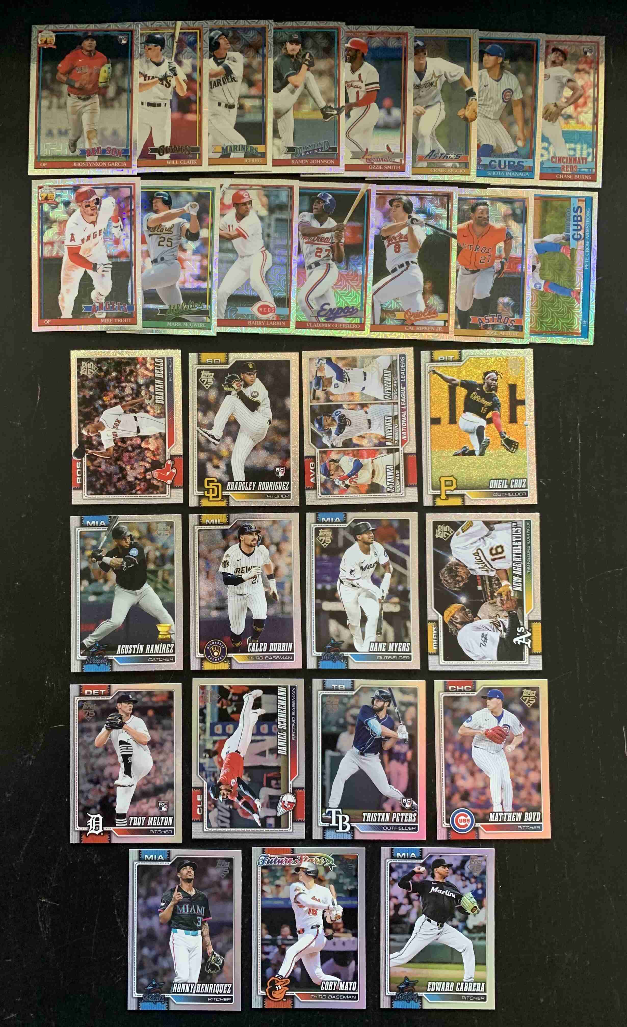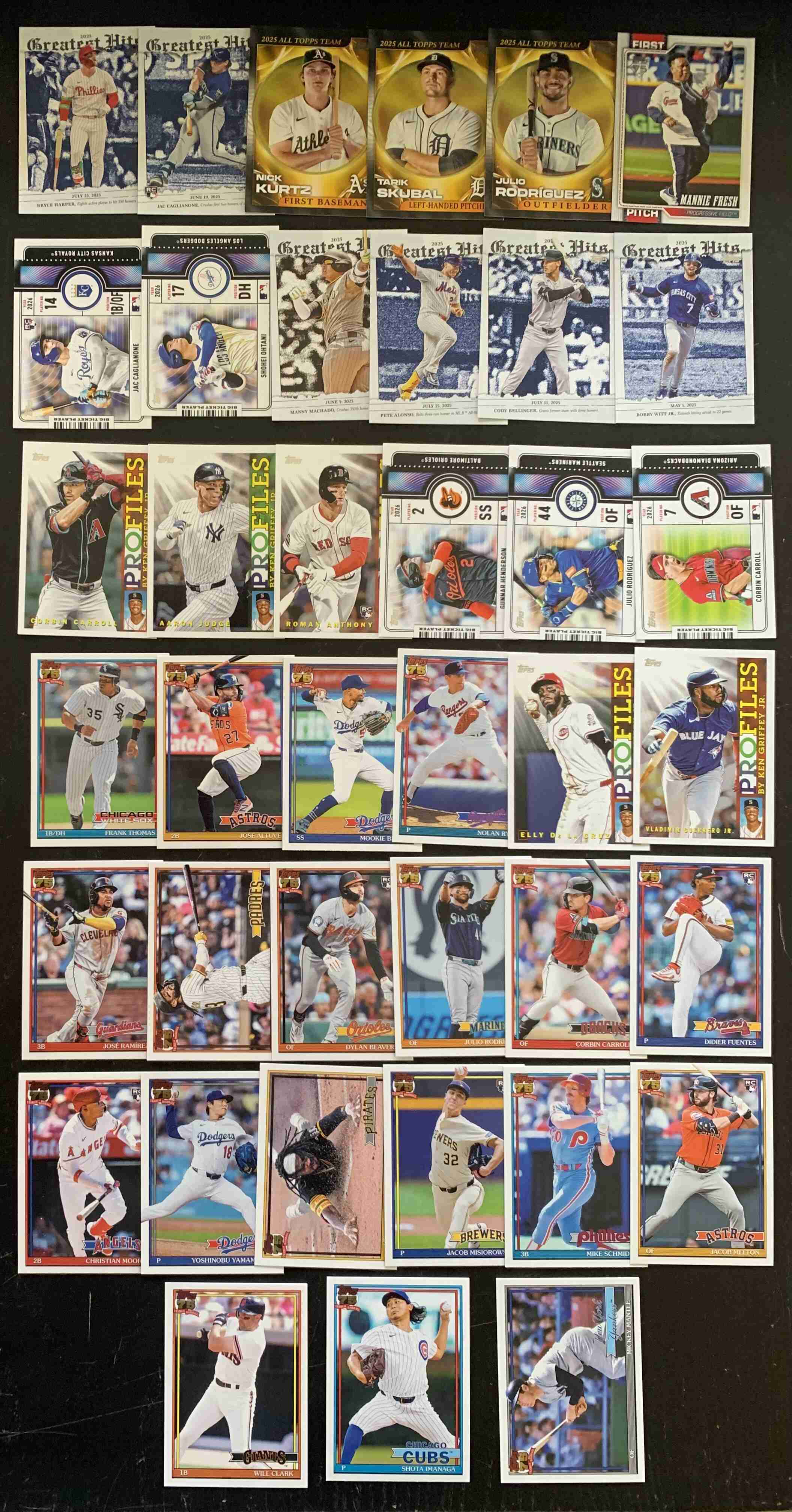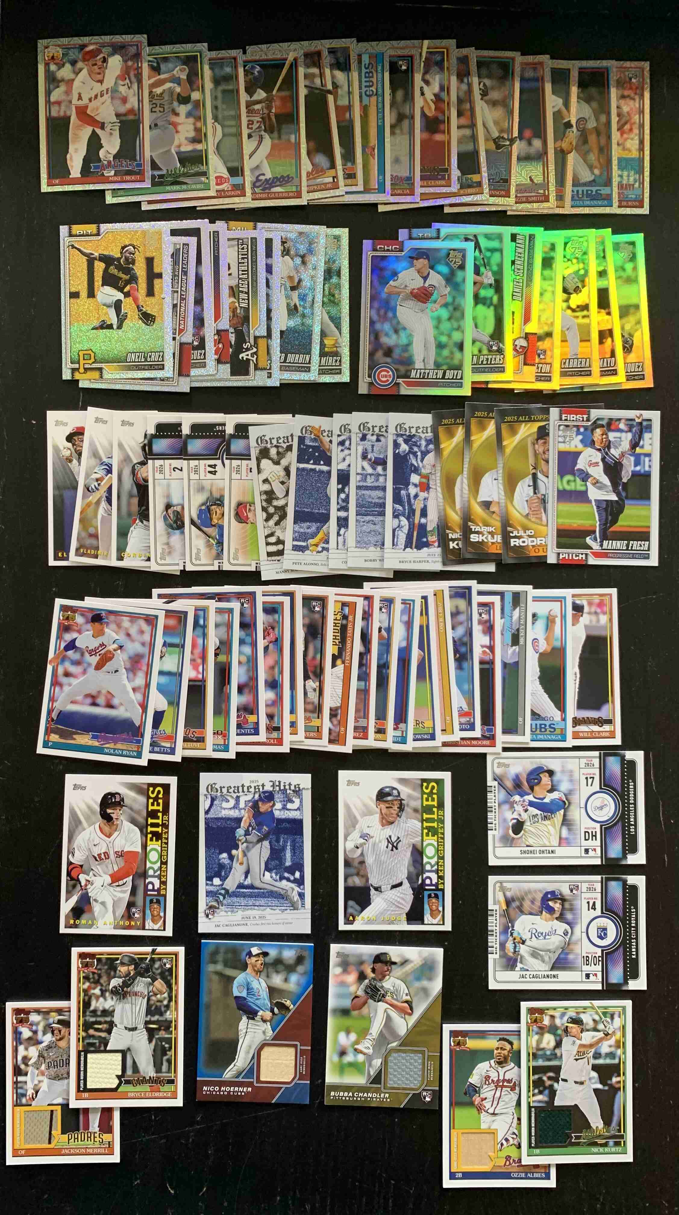 For auction is a lot of 75 Assorted Insert, Parallel, and Relic Cards from the BRAND NEW 2026 Topps Series 1 Set. Lot includes a mixture of Rookies, Stars, and Legends. There may be Minor Duplication. Lot Break Downs as Follows: Rainbow Foil Parallels - 7 Cards | Sandglitter Foil - 8 Cards | Silver Pack 1991 Mojo Refractors - 15 Cards | First Pitch - 1 Card | Big Ticket Players - 5 Cards | Profiles - 5 Cards | All Topps Team - 3 Cards | Greatest Hits - 6 Cards | 1991 35th Anniversary Inserts - 19 Cards | 1991 Design RELICS - 4 Cards | Major League Material RELICS - 1 Card | Major League Material BLUE PARALLEL RELIC #/150 - 1. Overall Cards are NM or better; however, the lot does include some outliers. Please refer to photos for more details - lot includes all cards pictured. Cards ship securely with tracking via USPS.