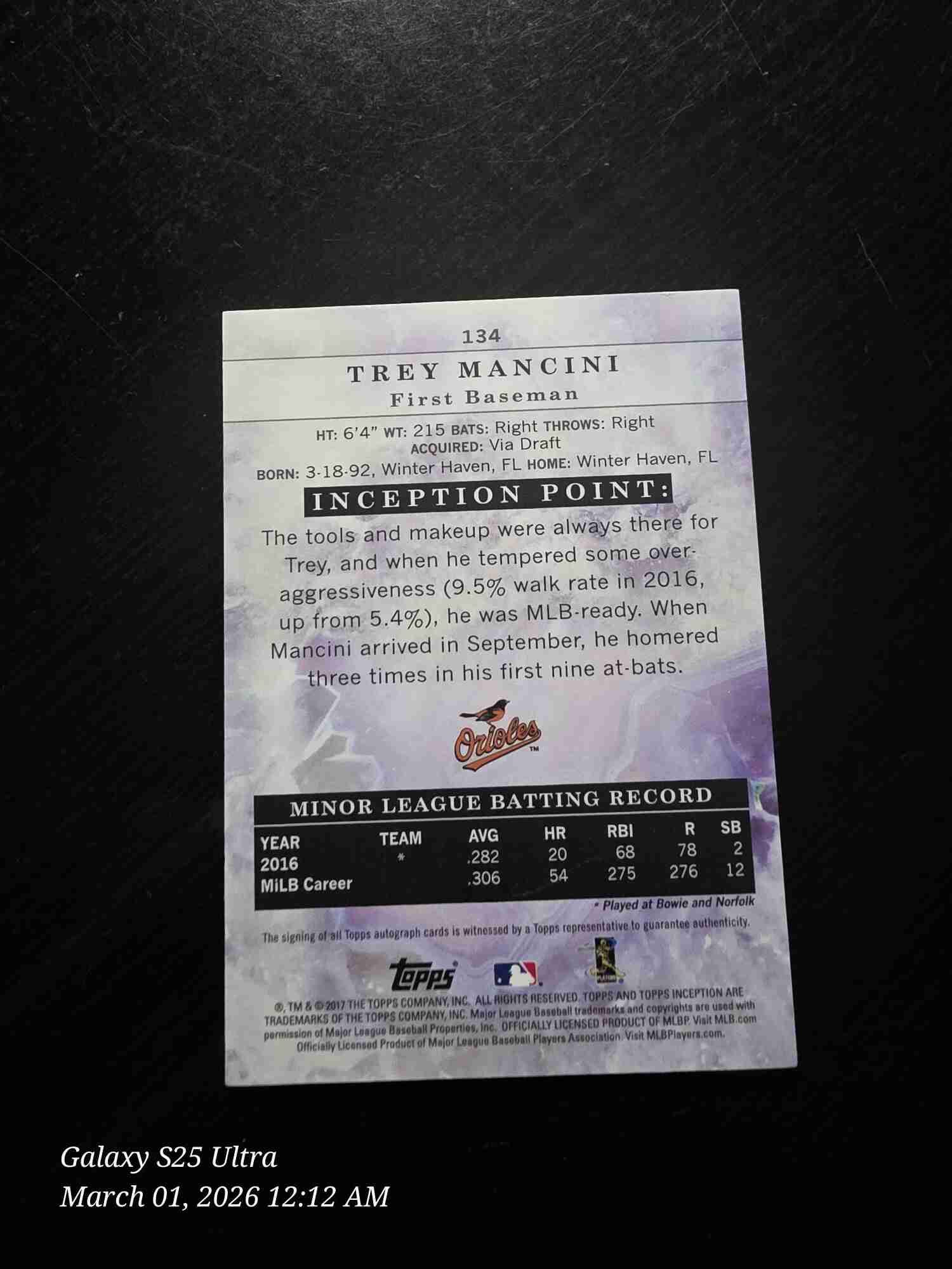 TREY MANCINI 2017 Topps Inception ROOKIE AUTO #/75. Card is in Nr-Mt condition.