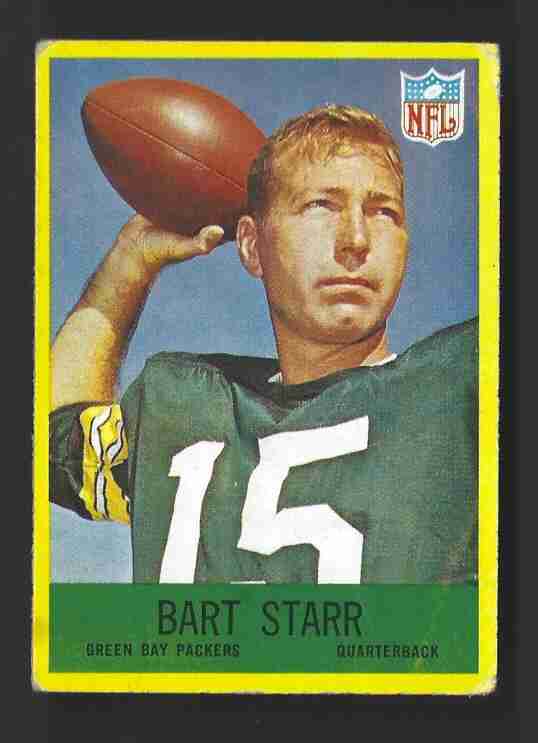 1967 Phila Gum Bart Starr (HOF) -#82- Packers. All-time great and one of the higher-valued cards from the 1967 Phila Gum Football set. This card is in the lower-grade range - corner wear. Decent shape for this era. Ships no tracking. Please review scans carefully for condition.
