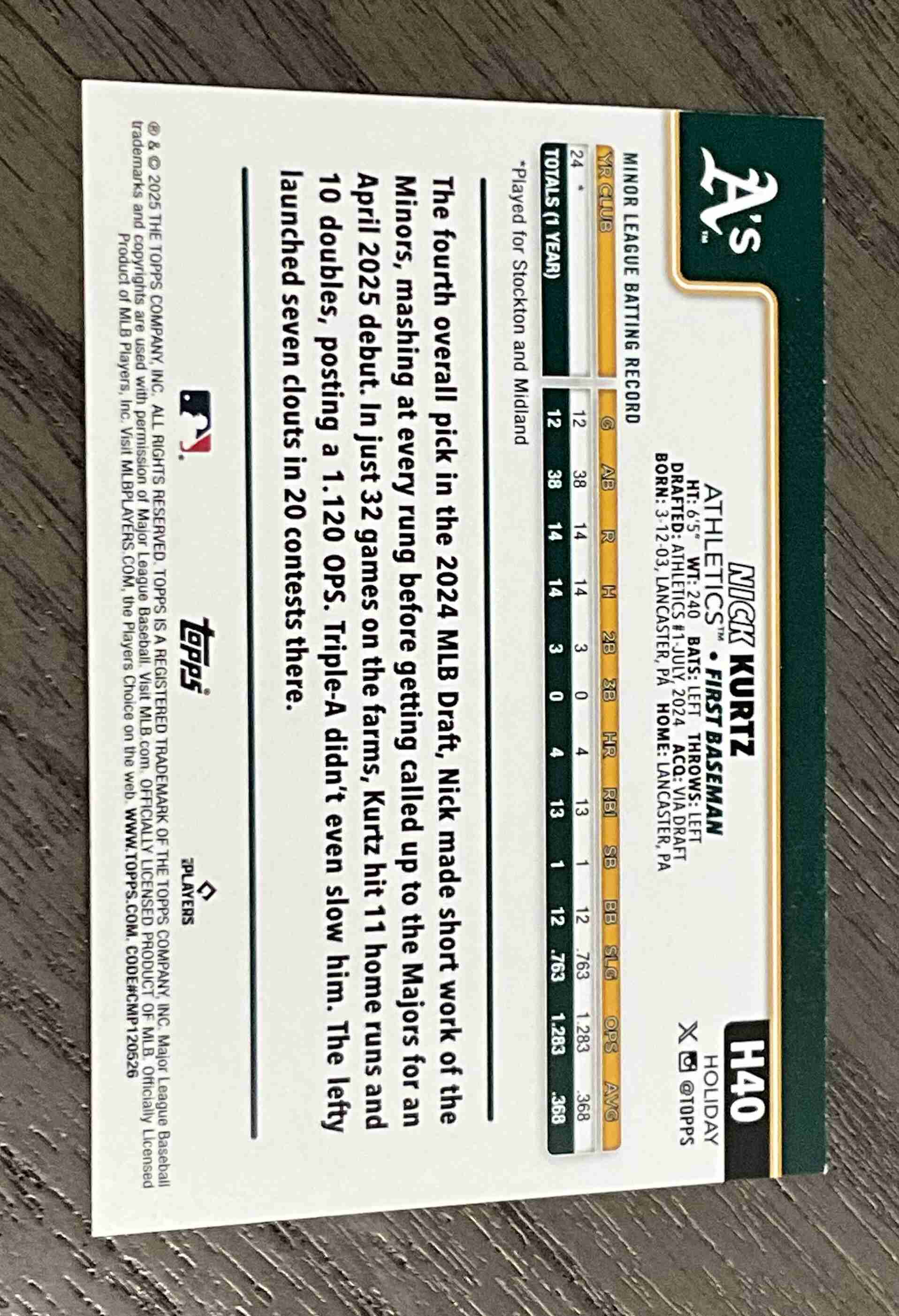 Nick Kurtz Rookie 2025 Topps Holiday # H40 Athletics