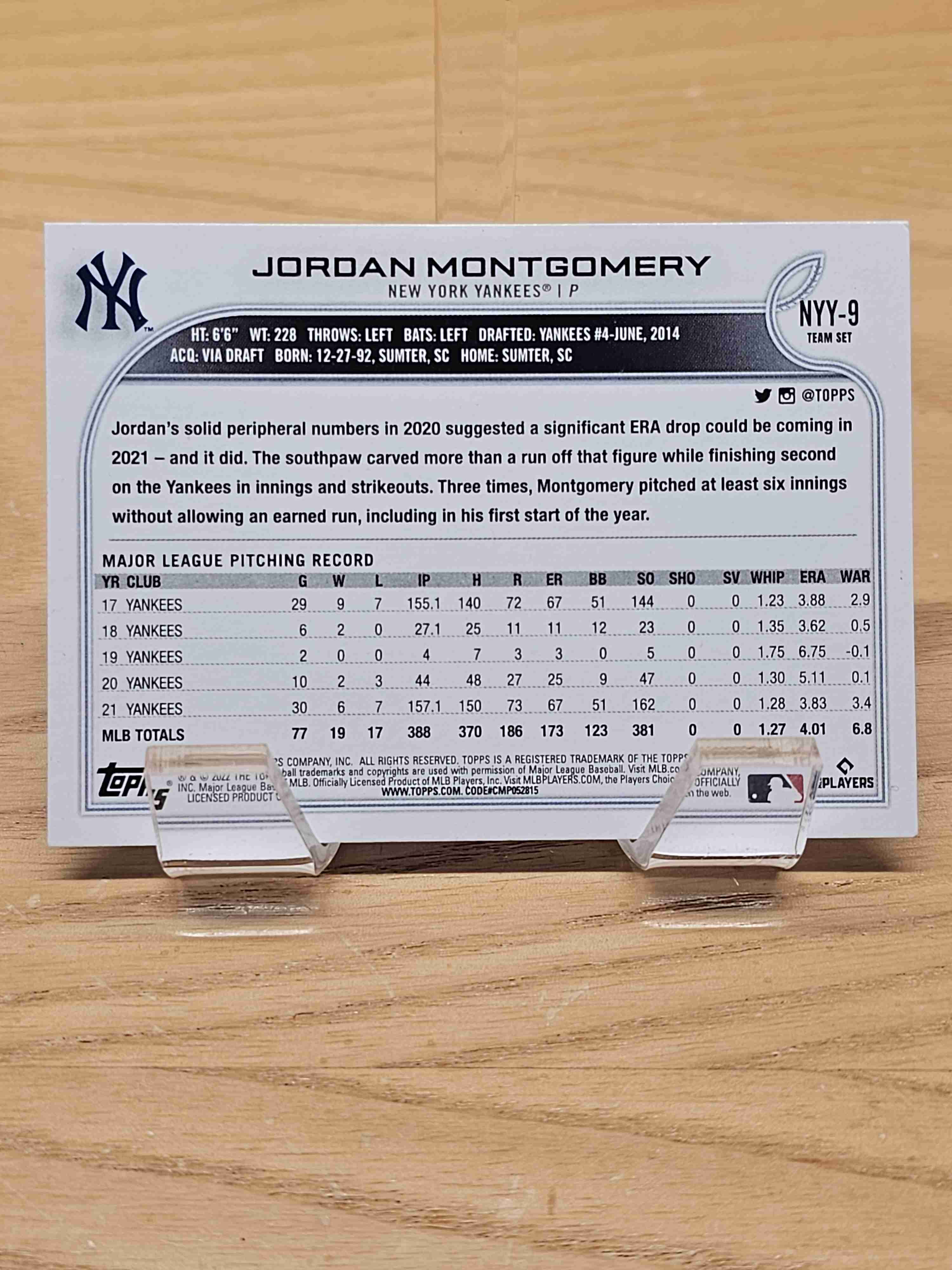 2022 Topps Baseball New York Yankees Team Set Jordan Montgomery New York Yankees Card #NYY-9