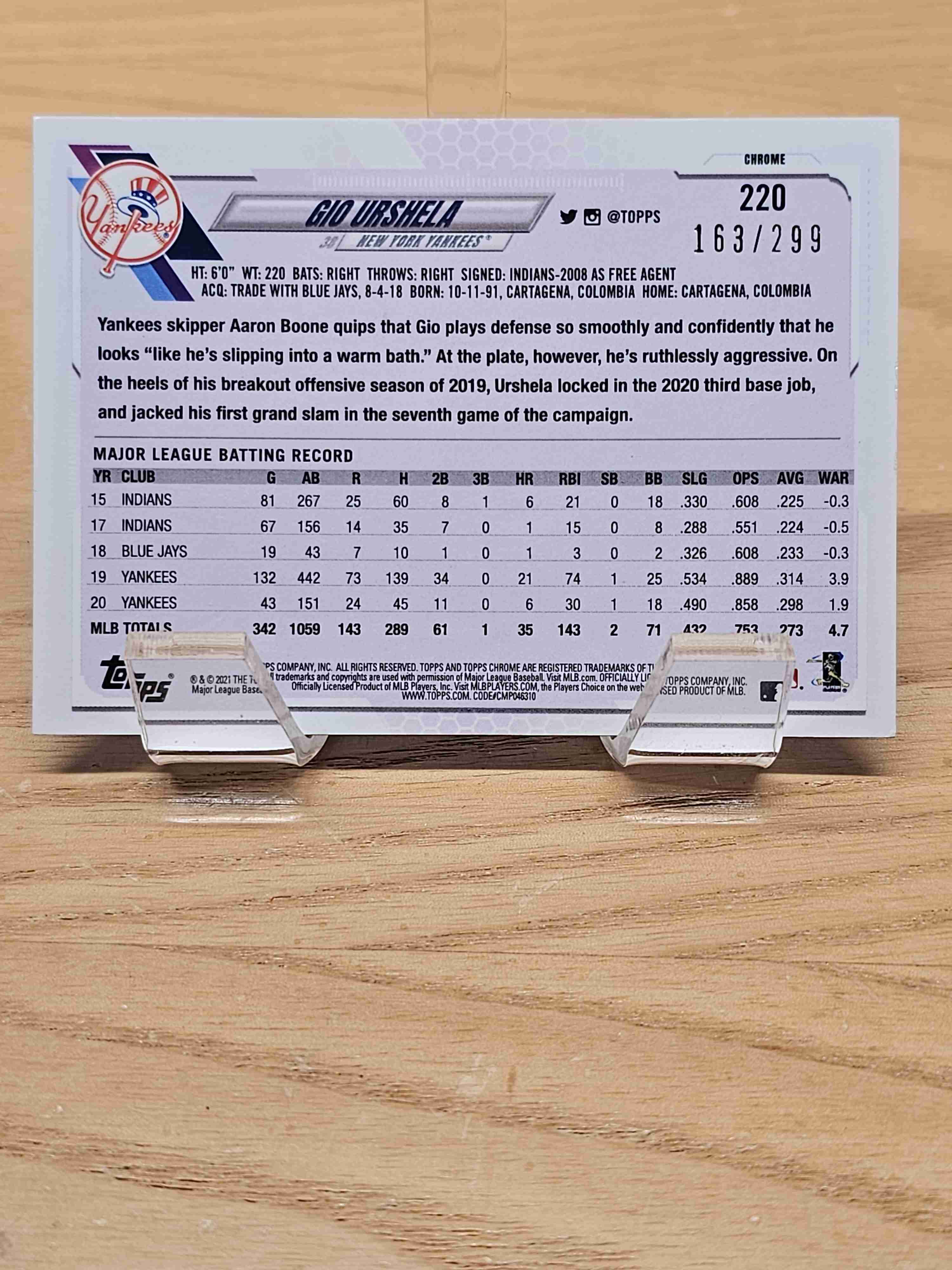 2021 Topps Chrome Baseball Purple Refractor /299 Gio Urshela New York Yankees Card #220