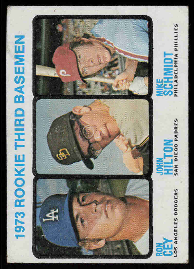 1973 Topps #615 Rookie Third Basemen card featuring Mike Schmidt and Ron Cey. This classic multi-player rookie card is one of the key cards from the iconic 1973 Topps baseball set and features Hall of Famer Mike Schmidt alongside Ron Cey, longtime Los Angeles Dodgers star.