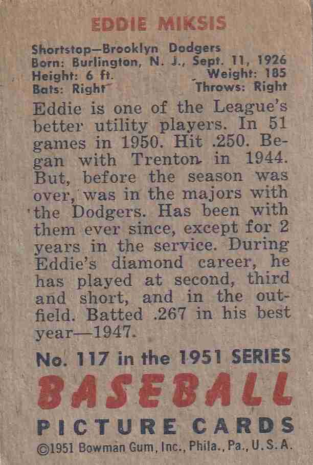 1951 Bowman #117 Eddie Miksis Brooklyn Dodgers