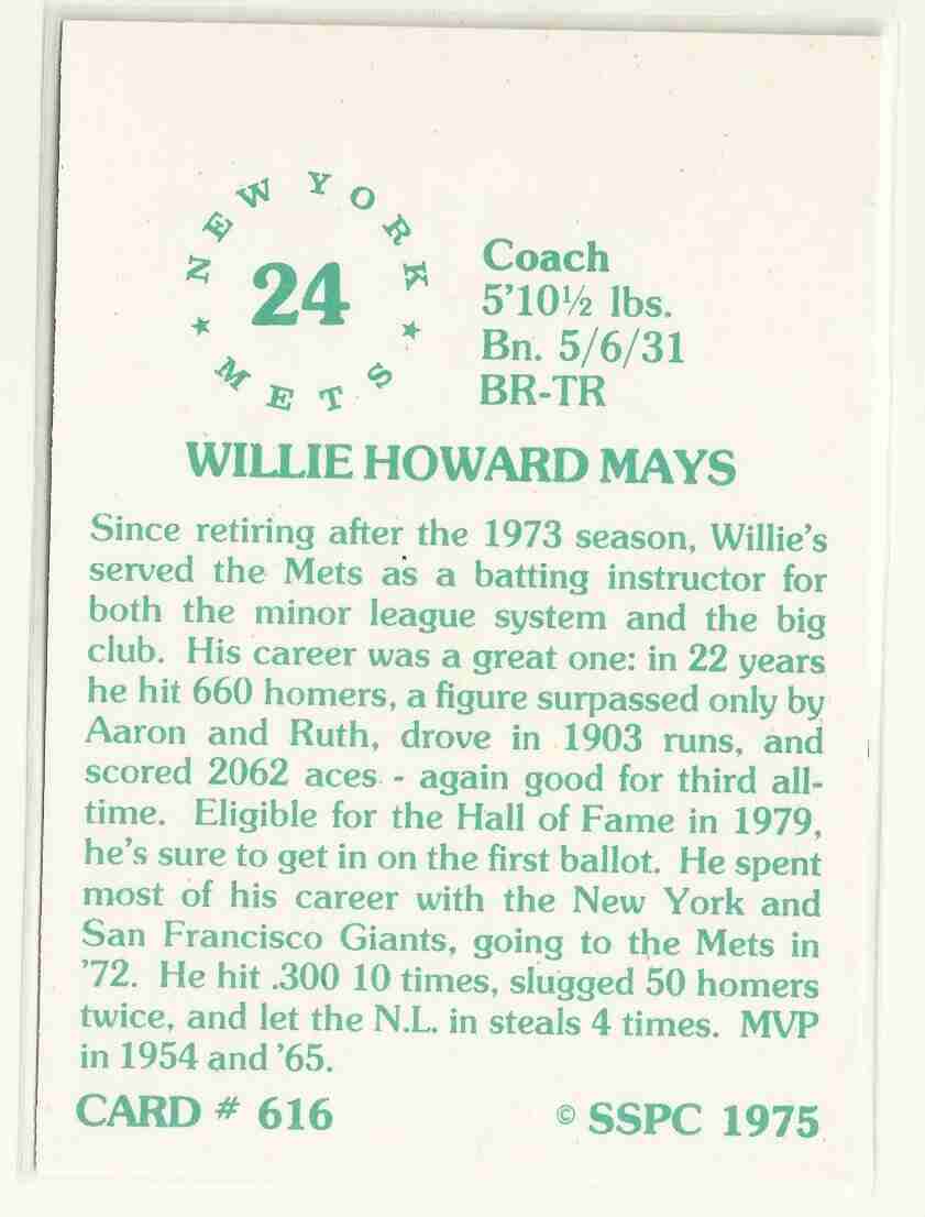 1975 SSPC #616 WILLIE MAYS New York Mets