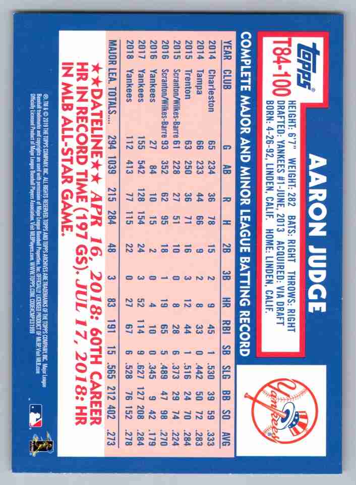 2019 TOPPS '84 TOPPS #T84-100 AARON JUDGE NEW YORK YANKEES