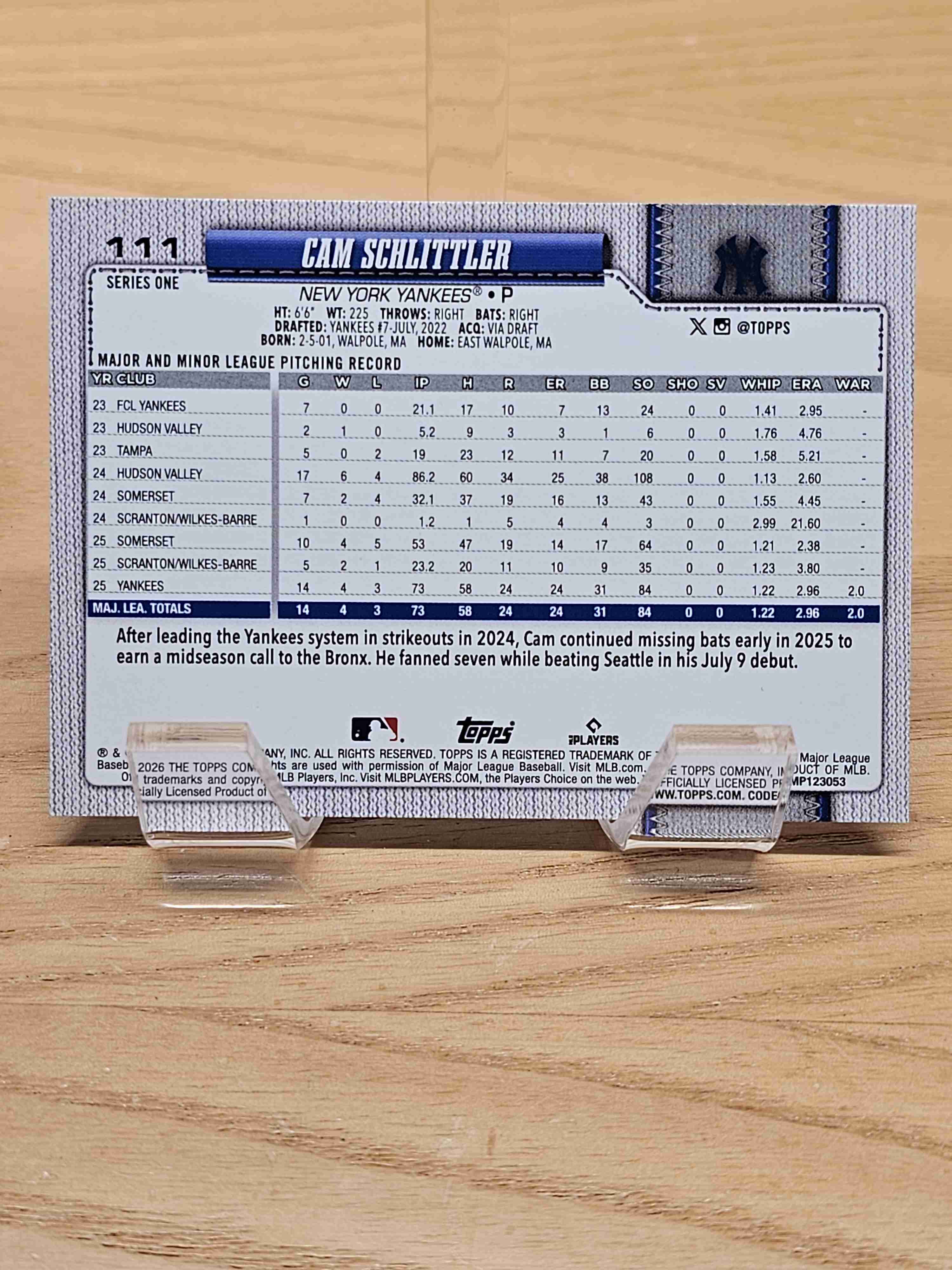 2026 Topps Series One Rookie RC Cam Schlittler Yankees #111