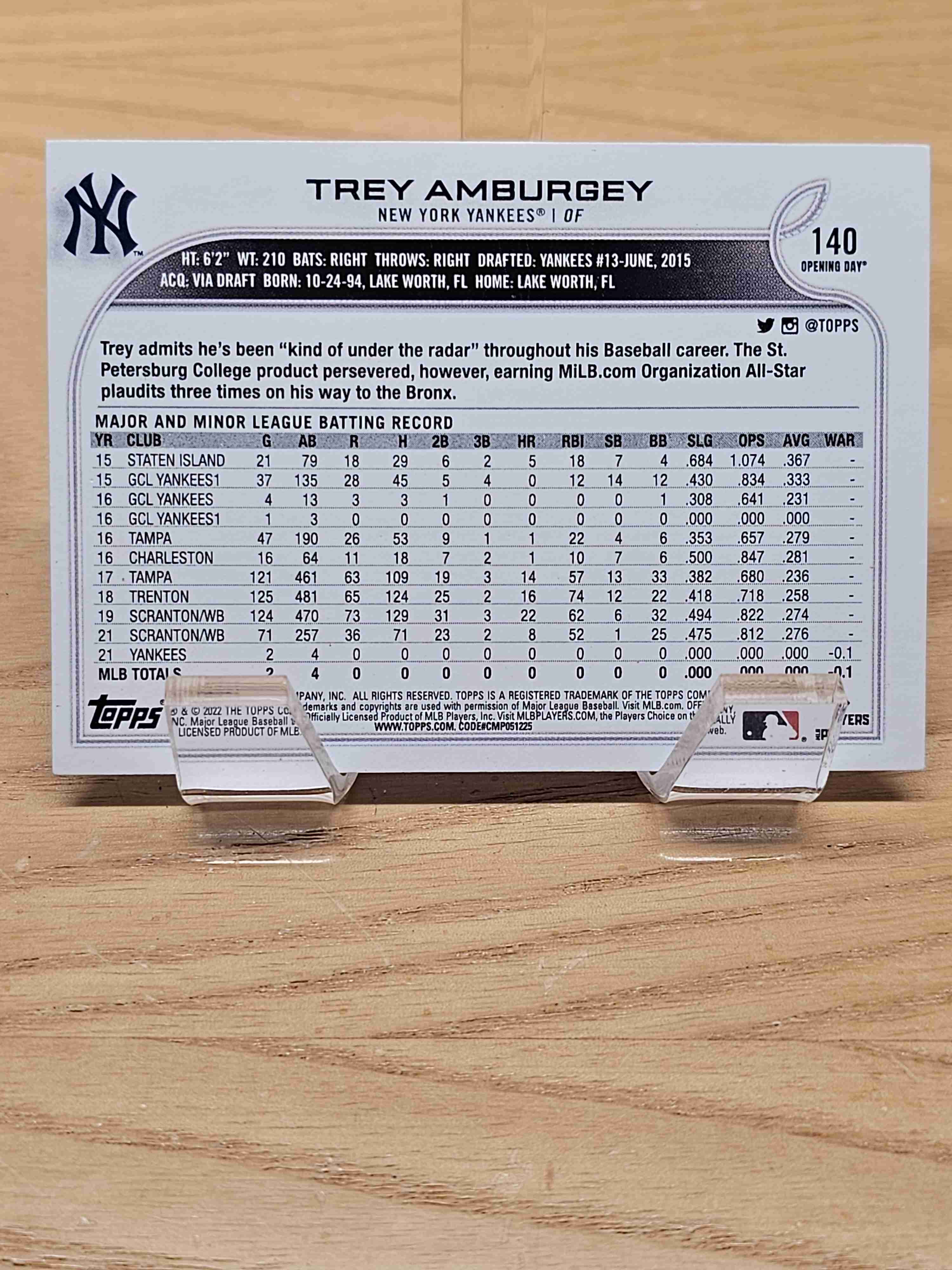 2022 Topps Opening Day Baseball Rookie RC Trey Amburgey New York Yankees Card #140