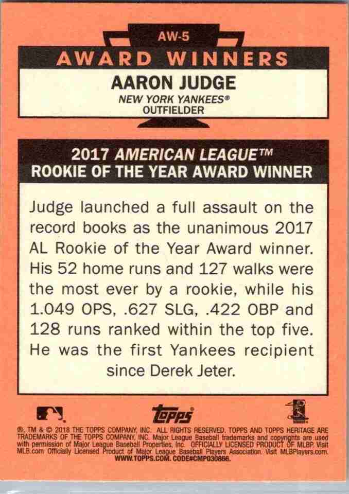 2018 Topps Heritage Award Winners AW-5 AARON JUDGE 2017 Rookie of the Year