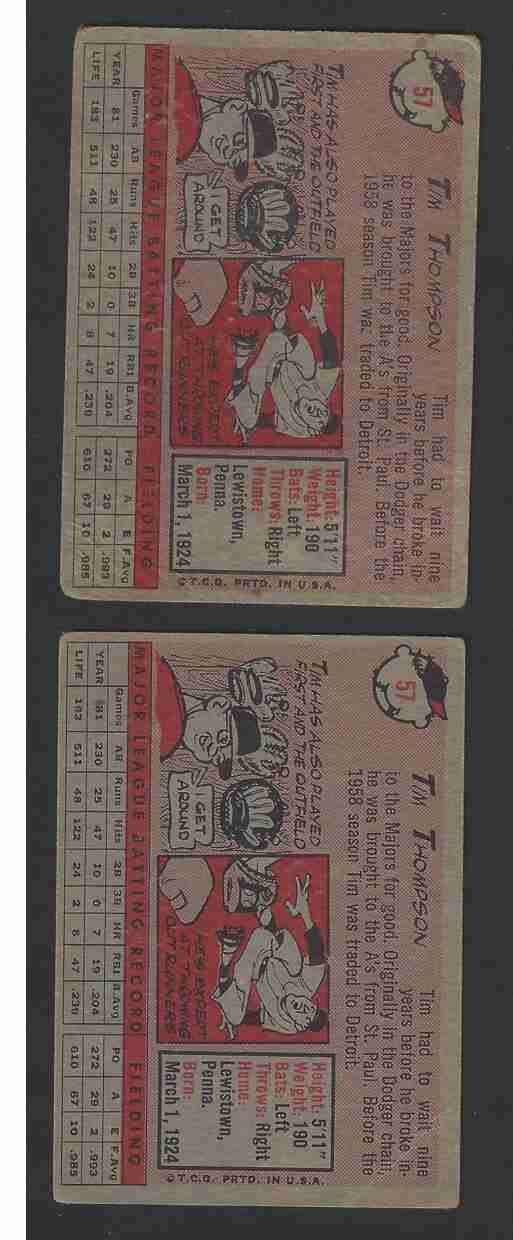 1958 Tim Thompson Topps -#57- Yellow & White Name. Extremely scarce Yellow Name variation. The card is low-grade. Good card to have if you are looking to fill this scarce spot in your collection. Throwing in the regular issued White Name card. Ships no tracking. Please review scans carefully for condition.