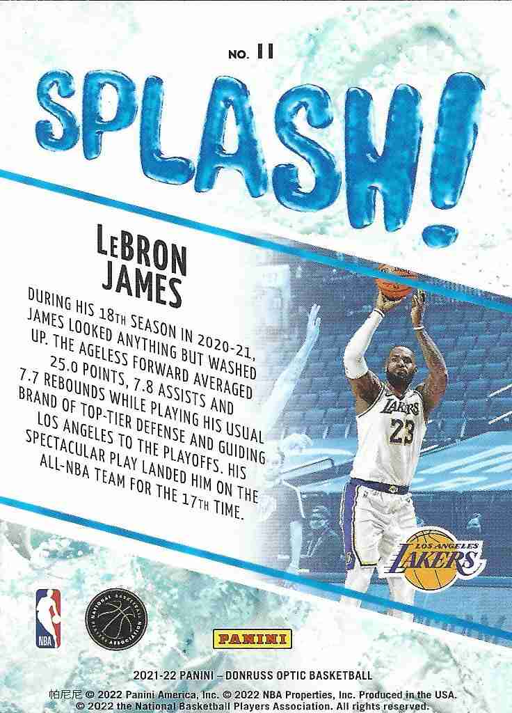 2021-22 Donruss Optic Splash! Insert Card (#11) of the Los Angeles Lakers superstar Lebron James.
