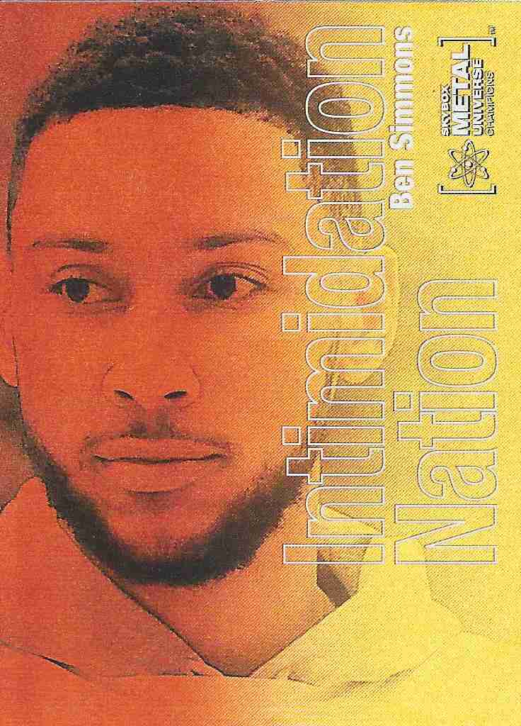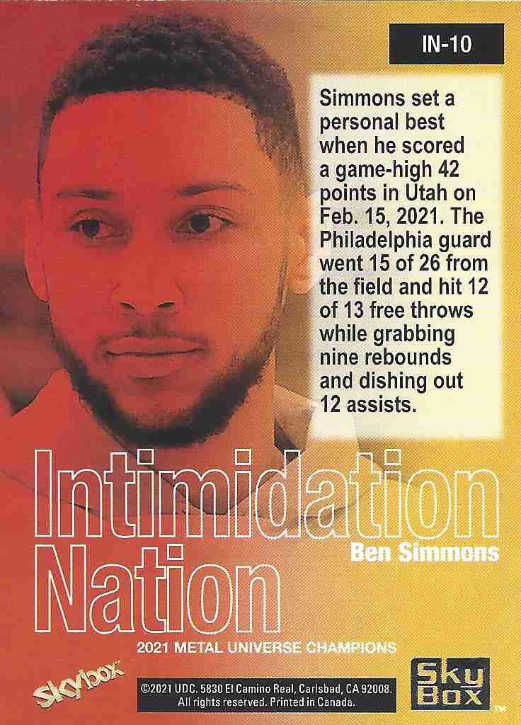 2021 Skybox Metal Universe Champions Intimidation Nation Insert Card (#IN-10) of the Philadelphia 76ers standout Ben Simmons.