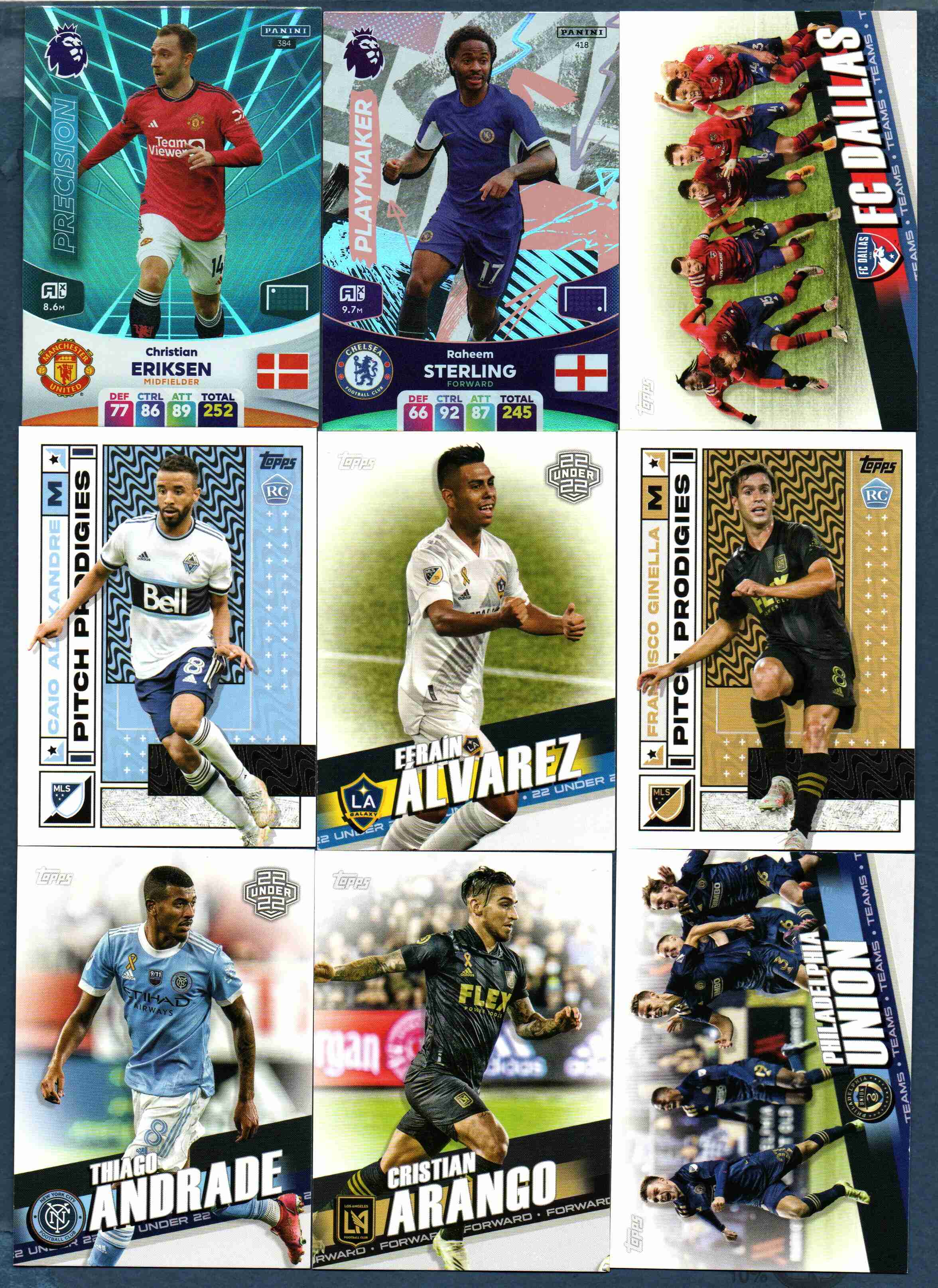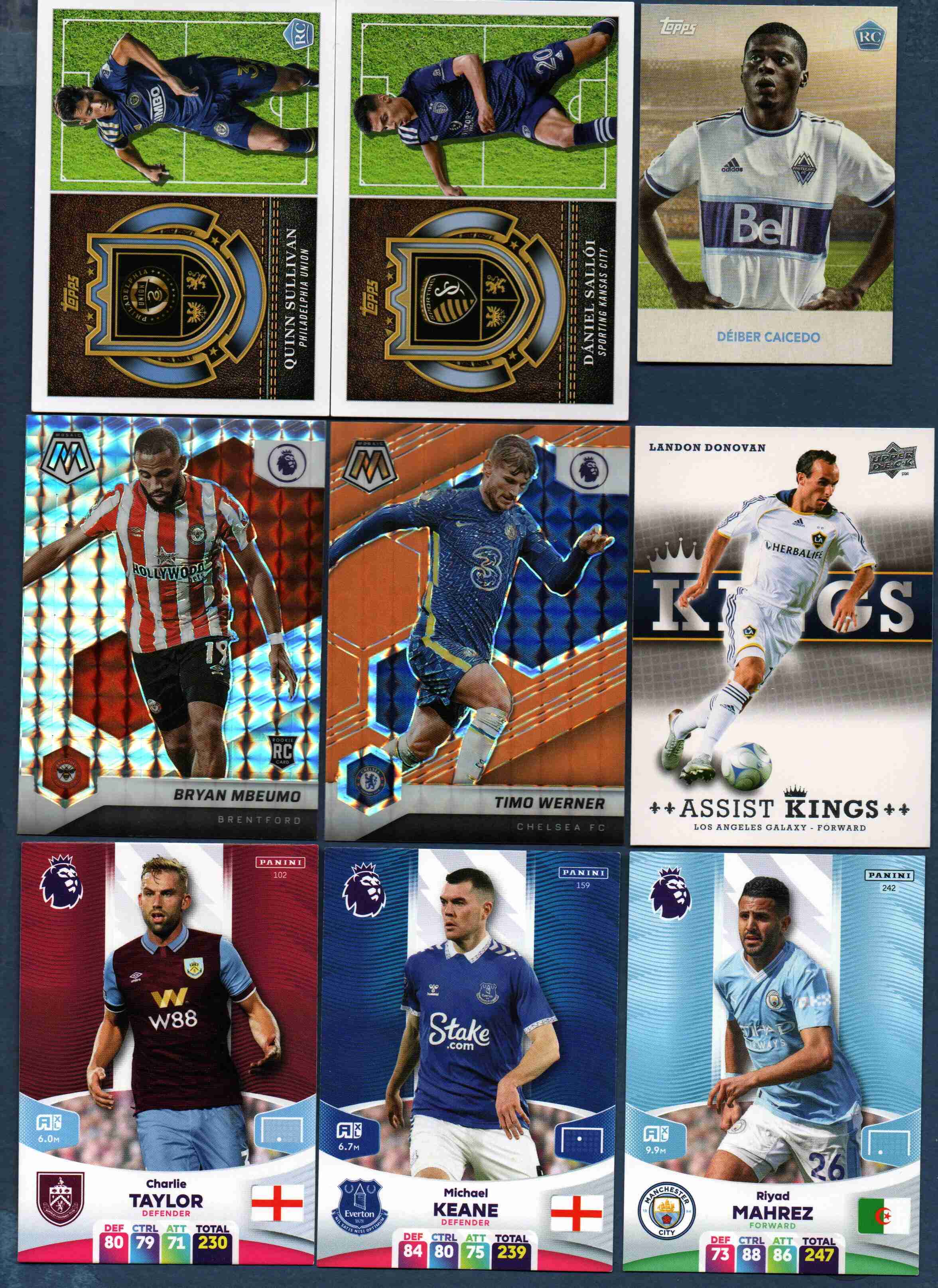 You are bidding on a 79 card lot of Soccer cards that are from 1991, 2008, 2021, 2022, & 2024. I know little to nothing about soccer cards. These are cards that my grandson gave me to sell. I scanned as many of them as I could. He picked the cards to scan. The following are what is included: 1991 Soccer Shots MLS #54 Scott Manning; 2008 Upper Deck MLS Assist Kings #AK-11 Landon Donovan; 2021 Panini Mosaic Premier League Mosaic #71 Bryan Mbeumo, 2021 Panini Mosaic Premier League Orange Fluorescent #9 Timo Werner; 2022 Topps MLS International Players #IP-1 Emanuel Reynoso & IP-21 Efrain Alvarez; 2022 Topps MLS Icy White Foil #30 Ryan Hollingshead, 93 Ake Loba, 106 Pedro Vite, & 161 Federico Navarro; 2022 Topps Chrome Merlin UEFA #41 Mykhailo Mudryk & 108 Johan Bakayoko; 2022 Topps MLS Scholarcy #S-3 Quinn Sullivan & S-11 Daniel Salloi; 2022 Topps MLS Mini #22M-18 Deiber Caicedo; 2022 Topps MLS base #’s 3, 10, 11, 16, 17, 19, 20, 24, 26, 29, 31, 34, 39, 40, 42, 44, 52, 53, 54, 57, 59, 64, 65, 66, 67, 68, 69, 71, 77, 89, 90, 95, 100, 103, 105, 109, 114, 115, 120, 125, 127, 128, 131, 135, 137, 139, 141, 143, 144, 149, 162, 163, 167, 168, 169, 172, 174, &190; & 2024 Panini Adrenalyn XL Premier League #102 Charlie Taylor, 159 Michael Keane, 242 Riyard Mahrea, 384 Christian Eriksen & 418 Raheem Sterling. You can view the scans of some of these cards. All cards are NM+ or better. The lot will be mailed via USPS Advantage Package the day following receipt of paymen