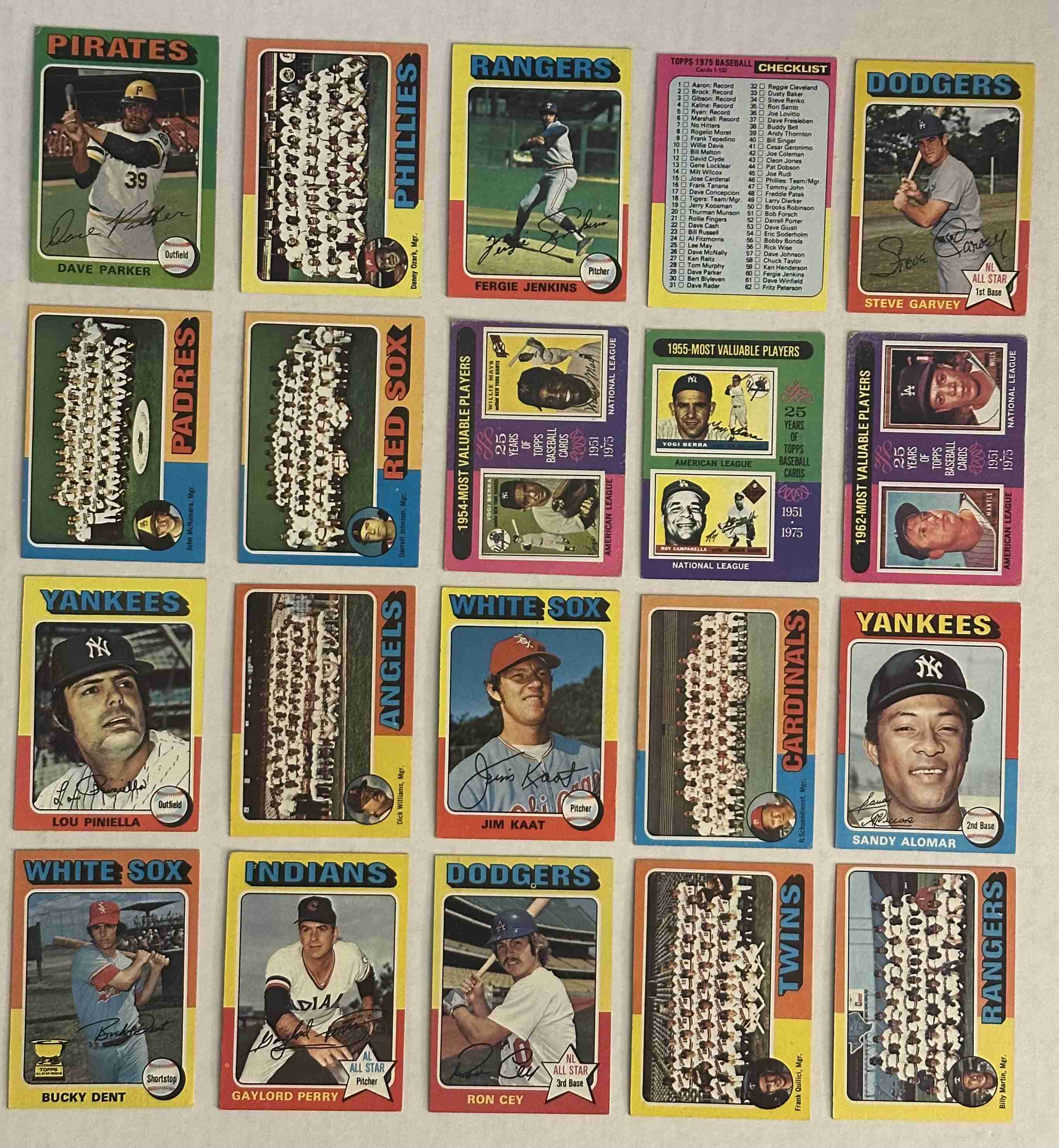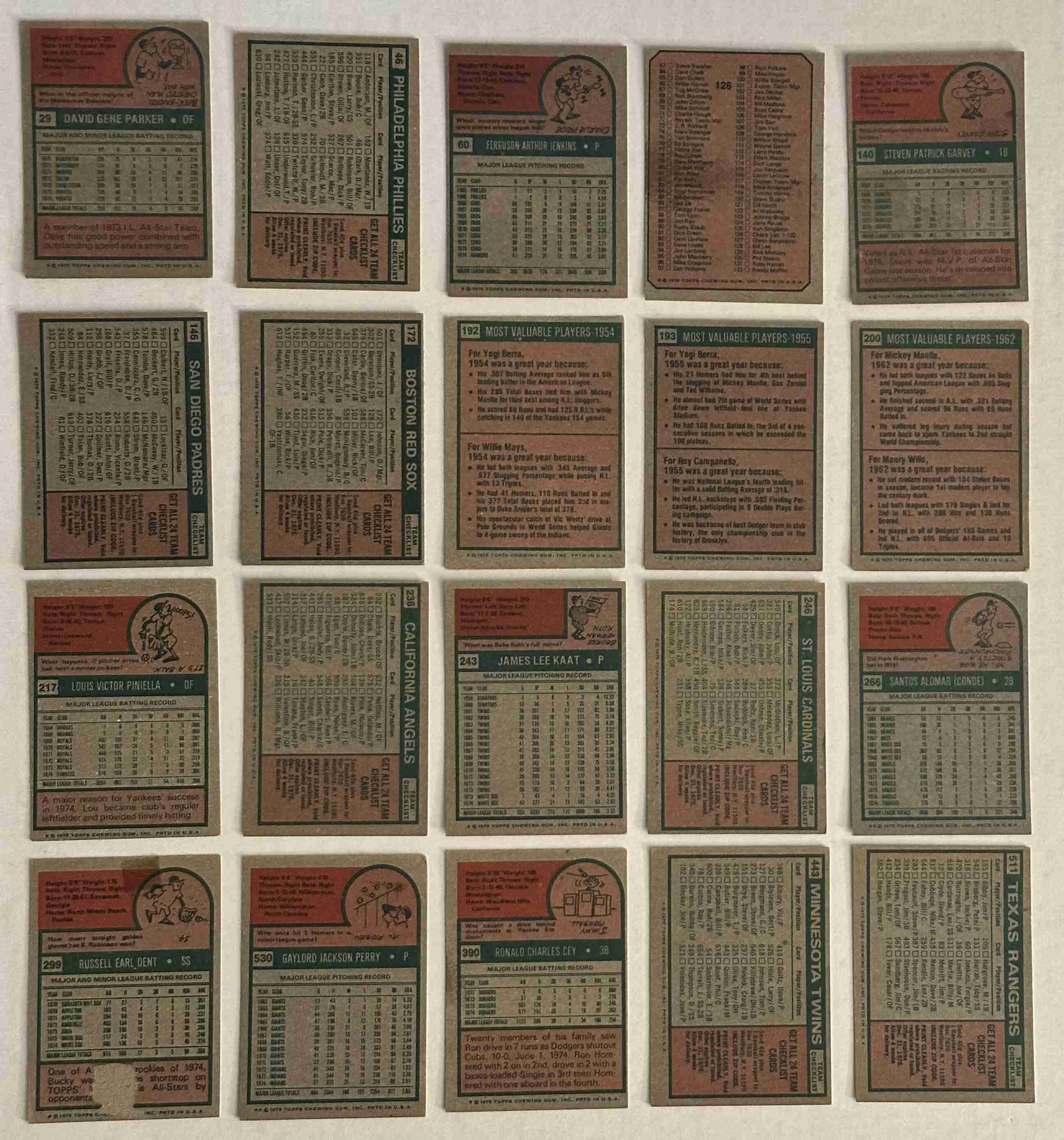 Cards included: 29 Parker, 46 Phillies, 60 Jenkins, 126 Checklist, 140 Garvey, 146 Padres, 172 Red Sox, 192 Berra/Mays, 193 Berra/Campanella, 200 Mantle/Wills, 217 Piniella, 236 Angels, 243 Kaat, 246 Cardinals, 266 Alomar, 299 Dent, 390 Cey, 443 Twins, 511 Rangers, 530 Perry