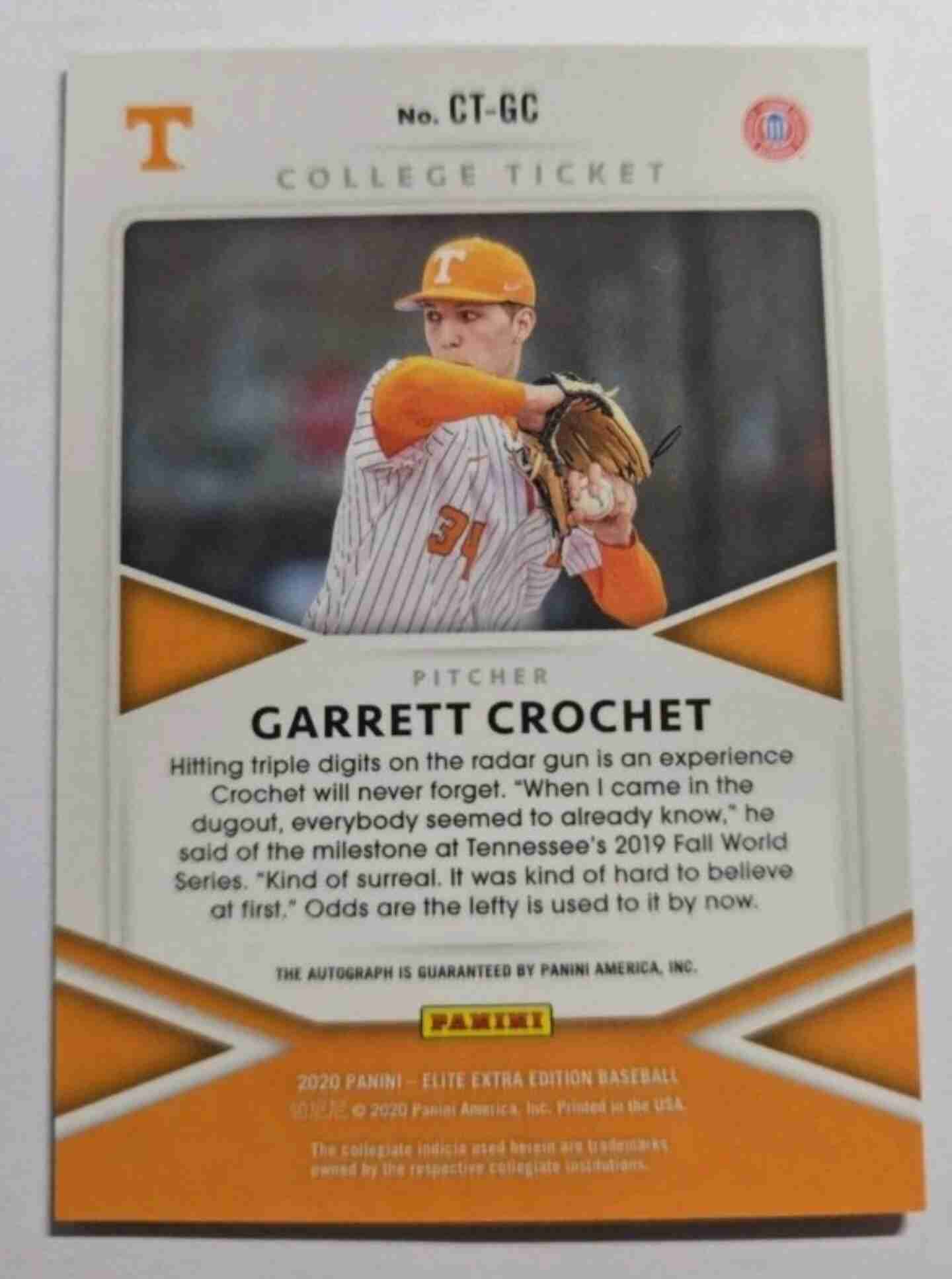 GARRETT CROCHET 2020 Panini Elite Extra Edition College Ticket Auto Red Sox. Card is in Nr-Mt condition.